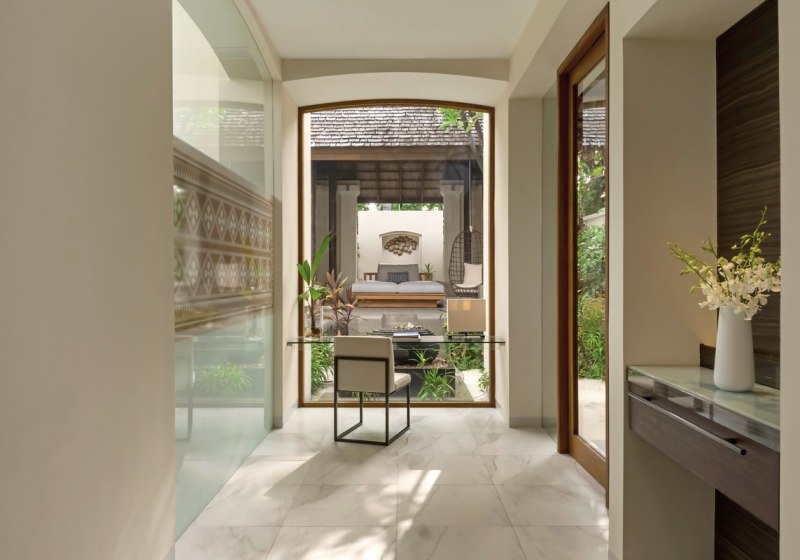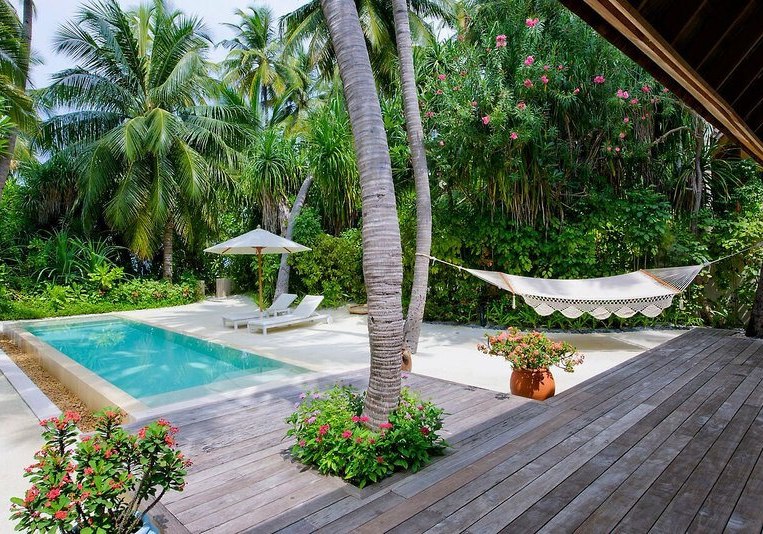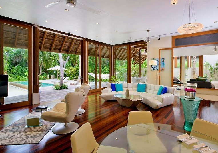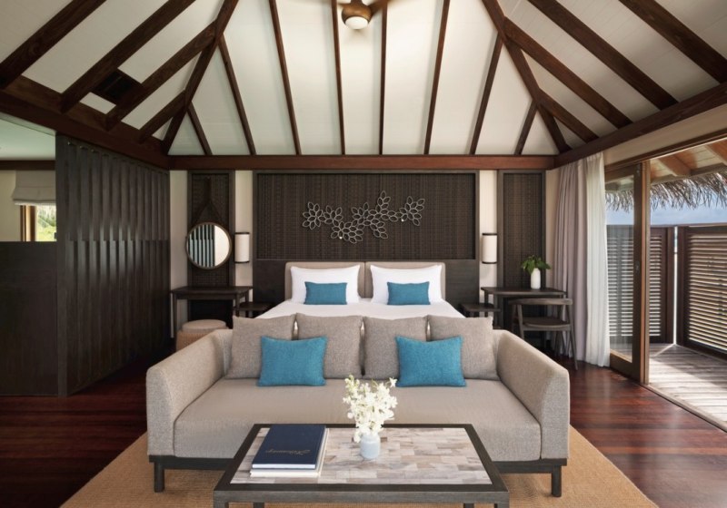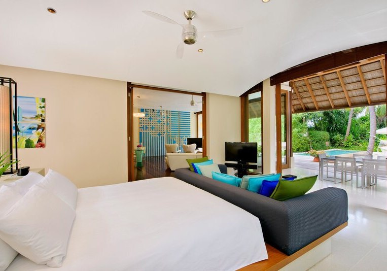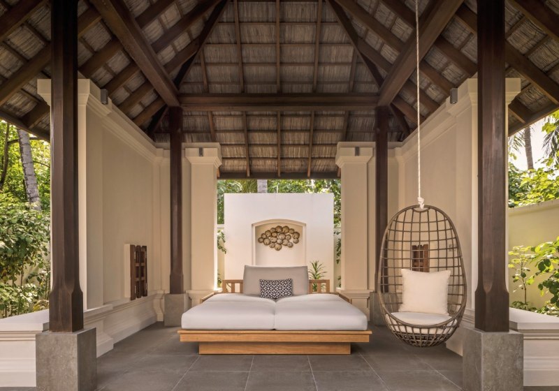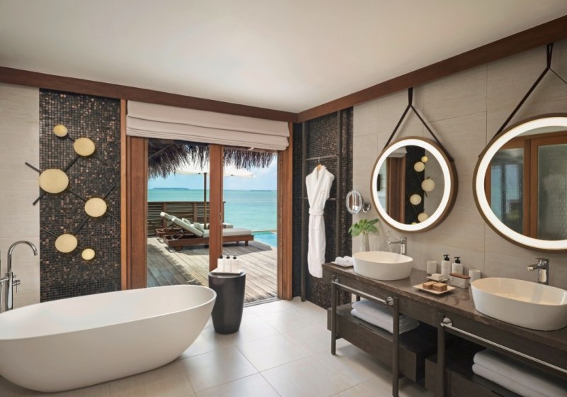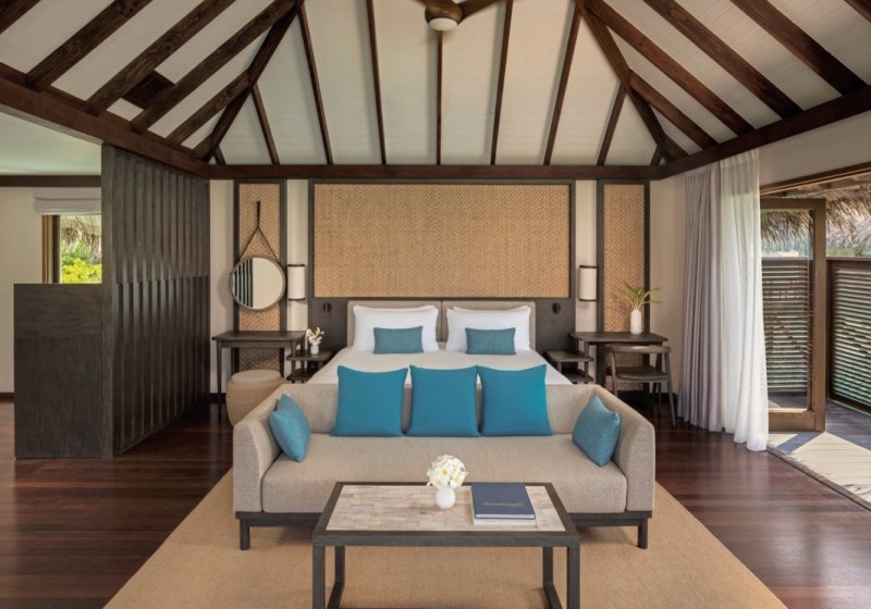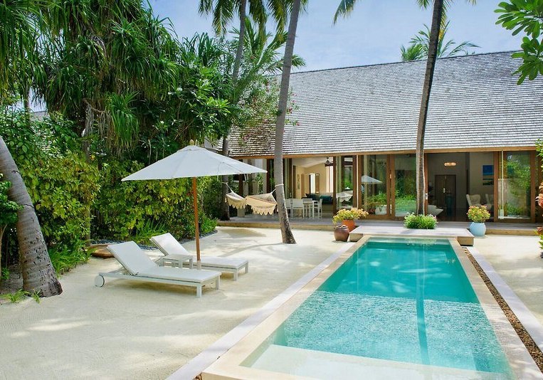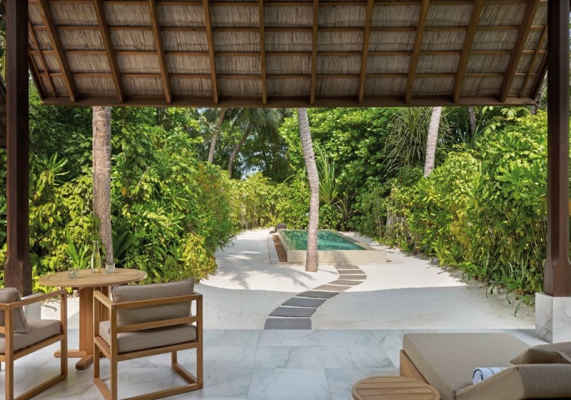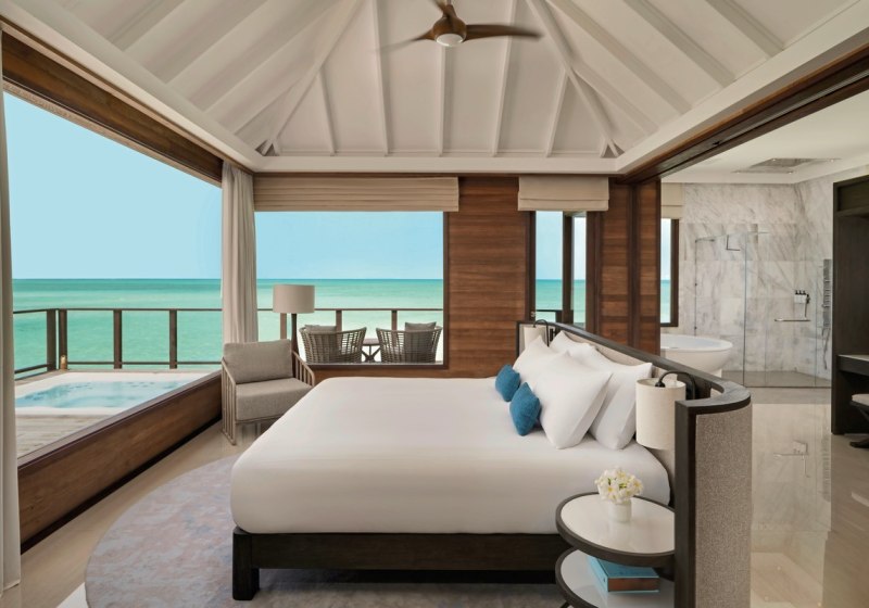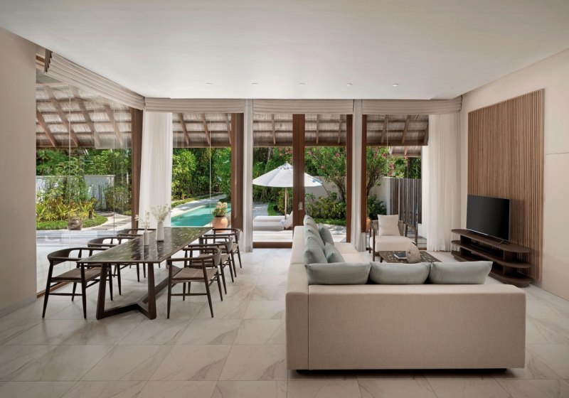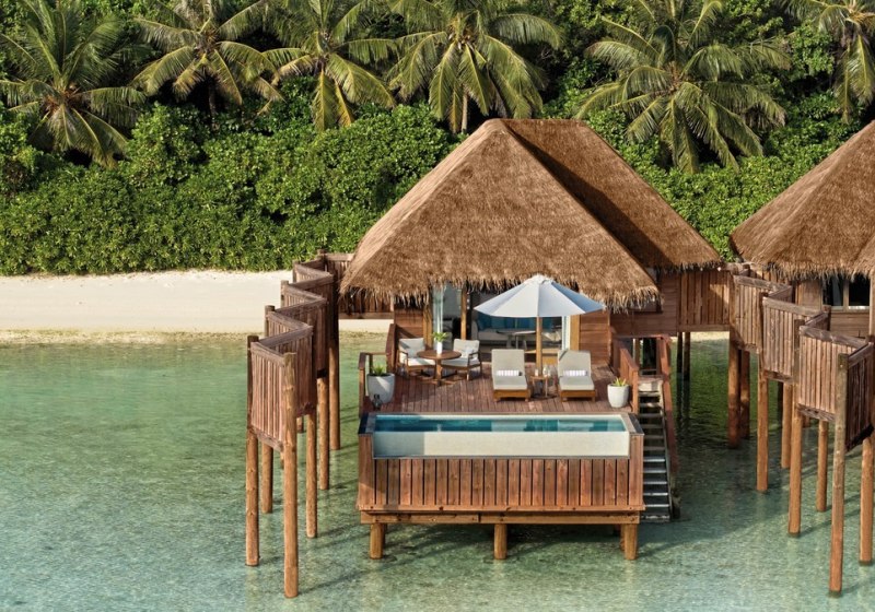 Über dem Wasser wohnt Ihr in der Sunrise Water Villa mit etwa 86 Quadratmetern, privatem Sonnendeck und Pool; zur Abendseite eröffnet die Sunset Water Villa ihre Sicht, ebenfalls mit privatem Plunge Pool. Die Deluxe Beach Villa (ca. 300 Quadratmeter) wurde 2019 renoviert und kombiniert Gartenbereiche mit Pool und zusätzlichem Plunge Pool.