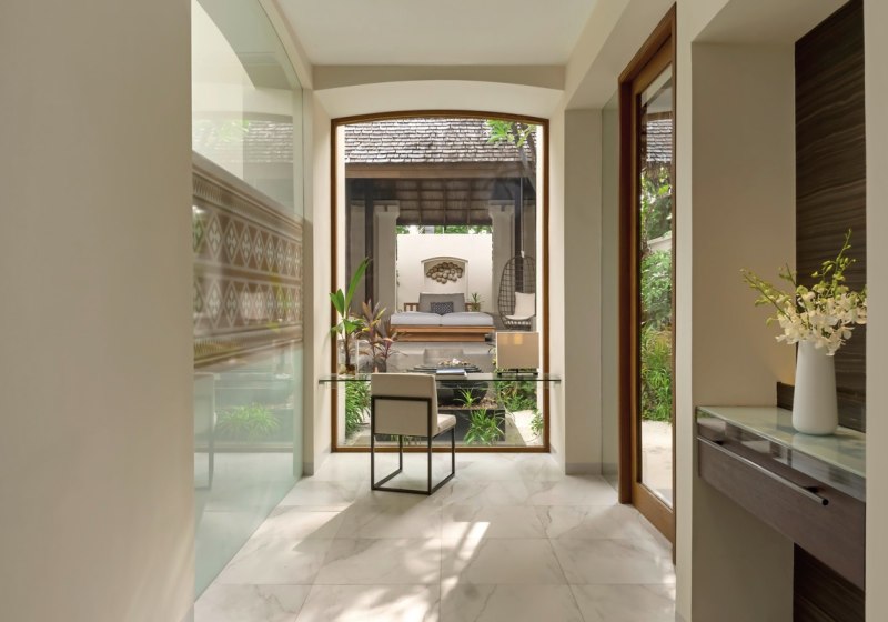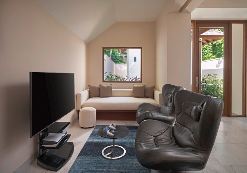 Die Beach Villa bietet rund 150 Quadratmeter Fläche, ein Bad mit Außendusche und eine möblierte Terrasse. Ausstattungsdetails wie Bademäntel, Slipper, Flatscreen, CD-/DVD-Player, iPod-Docking-Station, Safe und Kaffee-/Teezubereiter ergänzen Klimaanlage und Föhn – angenehm durchdacht, ohne Überladung.