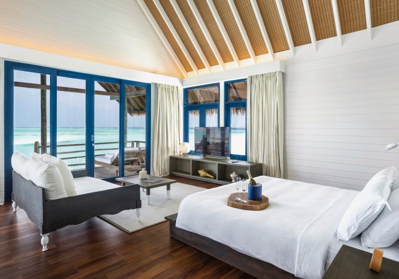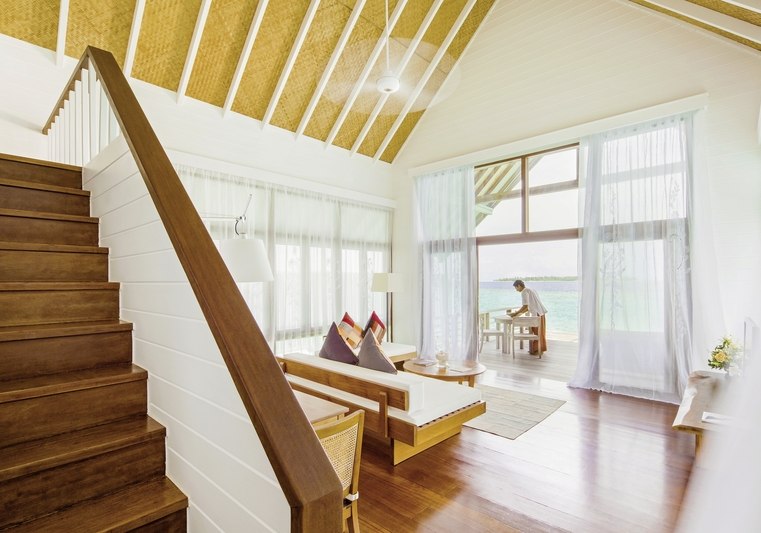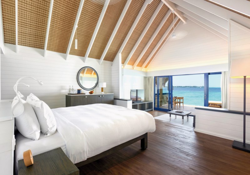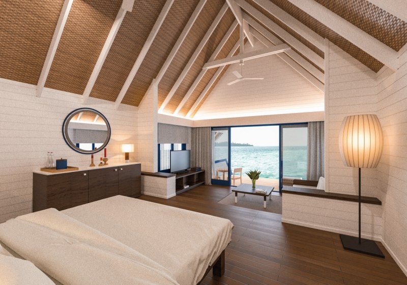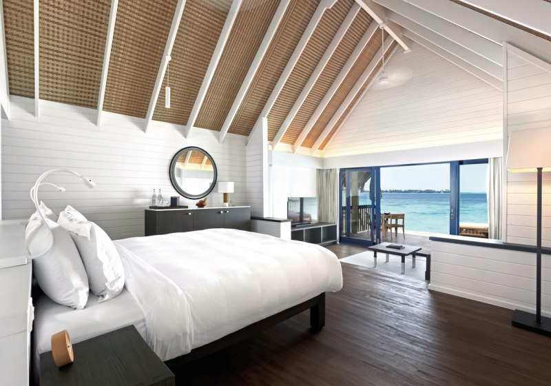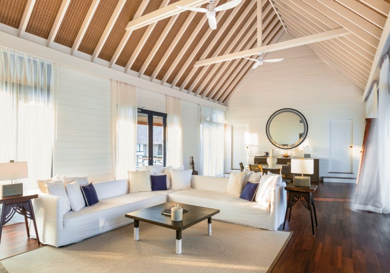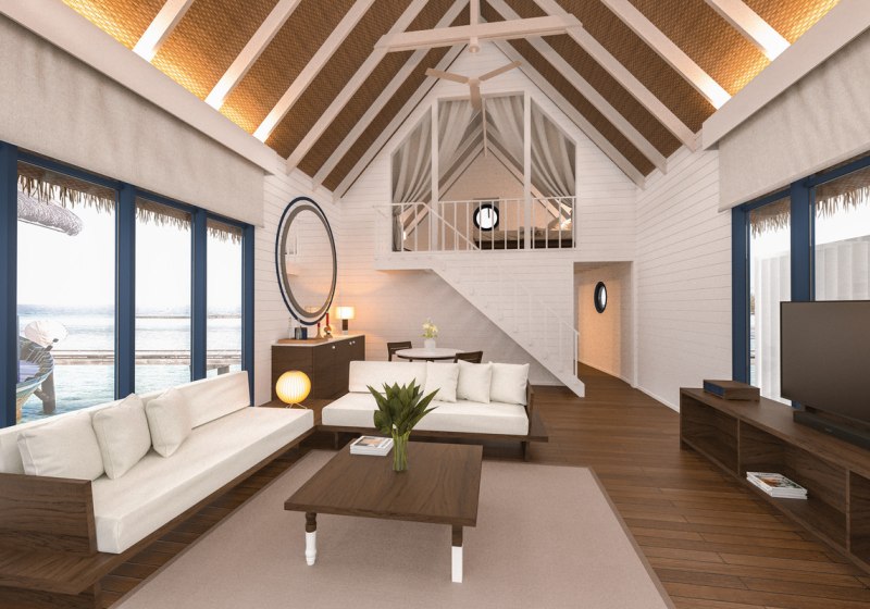 Ihr residiert in 34 Überwasservillen mit Größen von etwa 75 bis 123 m². Das Interieur ist auf Funktionalität und Ruhe ausgerichtet: Bad mit Badewanne und separater Dusche, Föhn, Klimaanlage, Safe und Sat‑TV. Eine Bose Soundbar, Telefon sowie Tee‑/Kaffeezubereiter runden die Ausstattung ab.