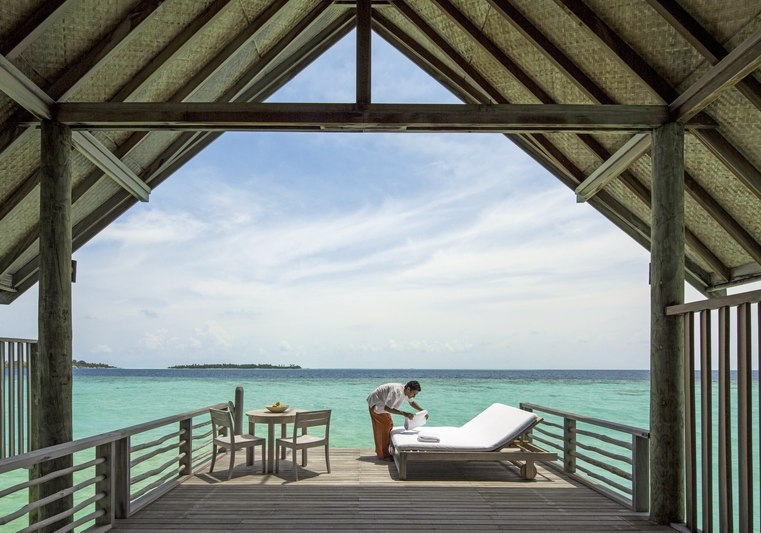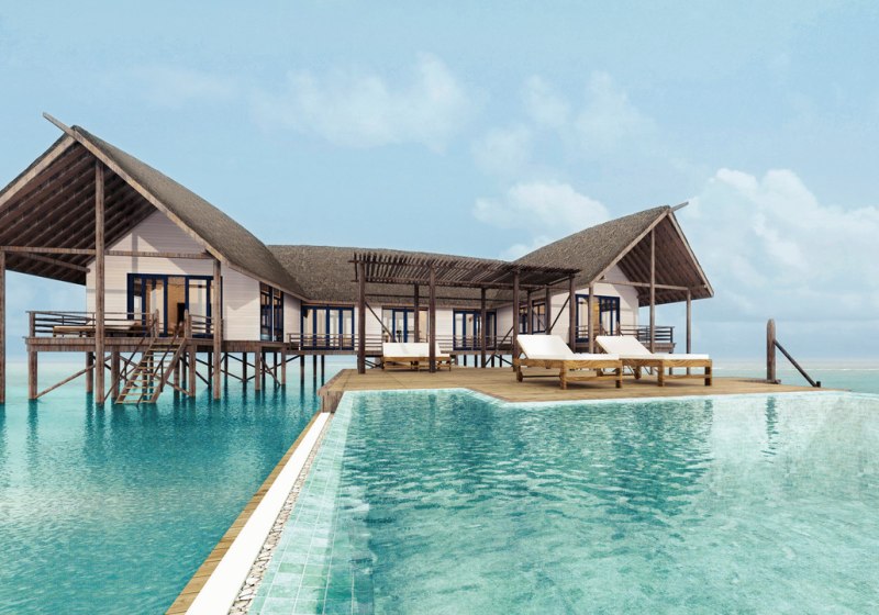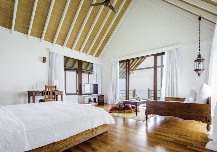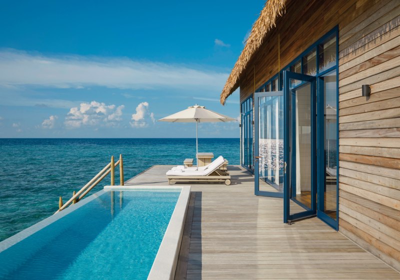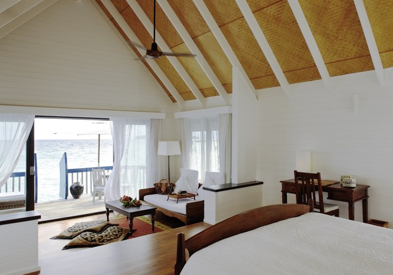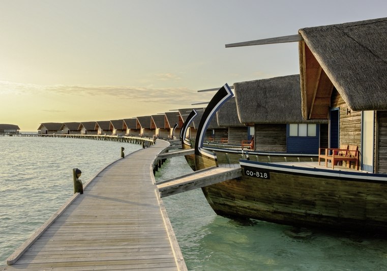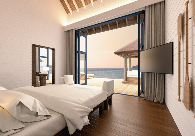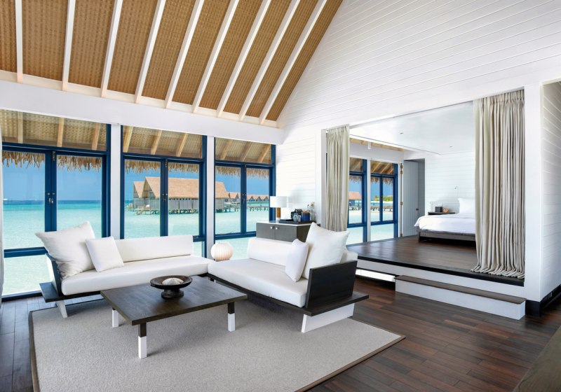 Ihr residiert in 34 Überwasservillen mit Größen von etwa 75 bis 123 m². Das Interieur ist auf Funktionalität und Ruhe ausgerichtet: Bad mit Badewanne und separater Dusche, Föhn, Klimaanlage, Safe und Sat‑TV. Eine Bose Soundbar, Telefon sowie Tee‑/Kaffeezubereiter runden die Ausstattung ab.