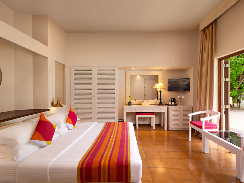 Die Classic Beach View Rooms (ca. 38 m²) liegen ebenerdig in Vierergebäuden und führen über Terrassen direkt zum Strand. Dusche, WC, Föhn, Klimaanlage und Deckenventilator sorgen für Komfort, ergänzt durch Telefon, TV, Safe, Minibar (gegen Gebühr) sowie Kaffee- und Teezubereiter.
