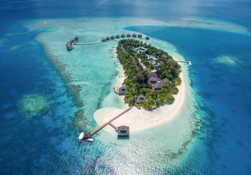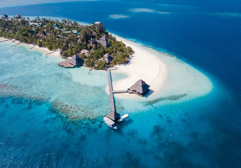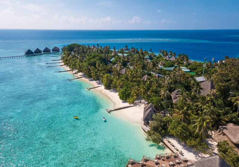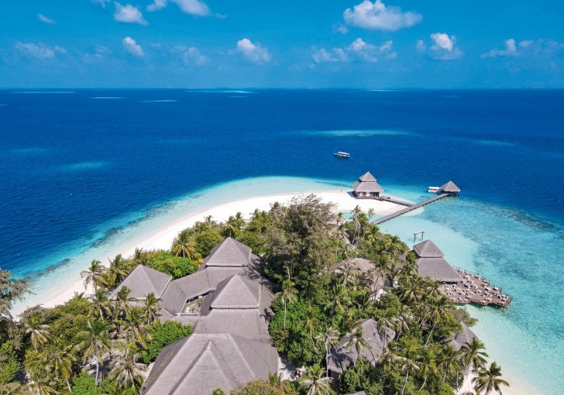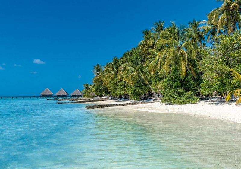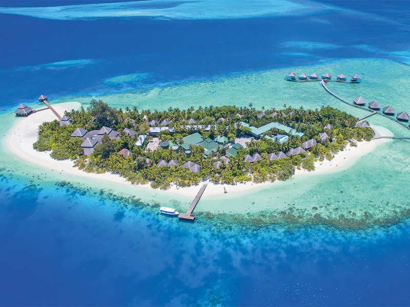 Ihr erreicht die Insel per Speedboat in etwa 35 Minuten vom Flughafen Malé. Das Eiland liegt im Süd-Male-Atoll, kompakt und übersichtlich, von hellem Sand umsäumt und von einer grossen Lagune eingerahmt. Das Hausriff befindet sich rund 50 Meter vom Ufer entfernt – nah genug für spontane Schnorchelgänge direkt nach dem Frühstück.