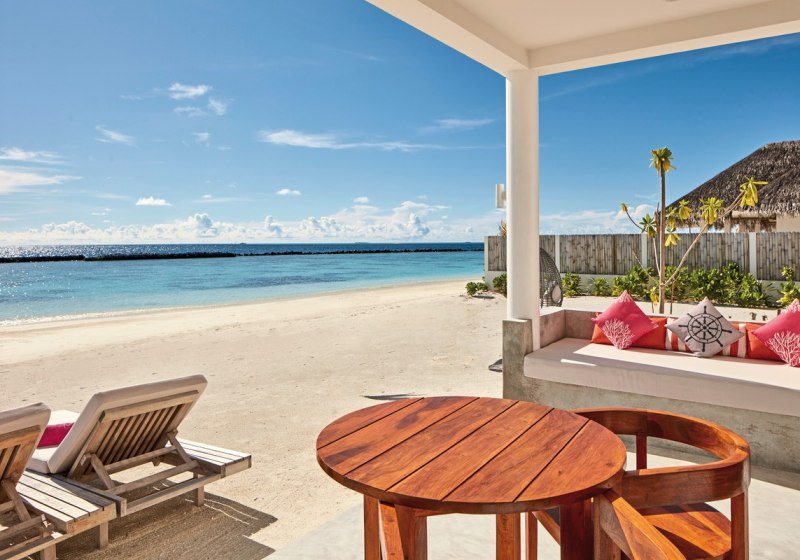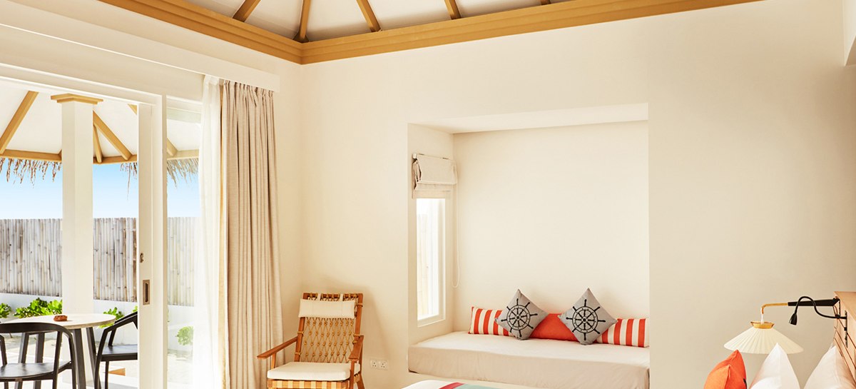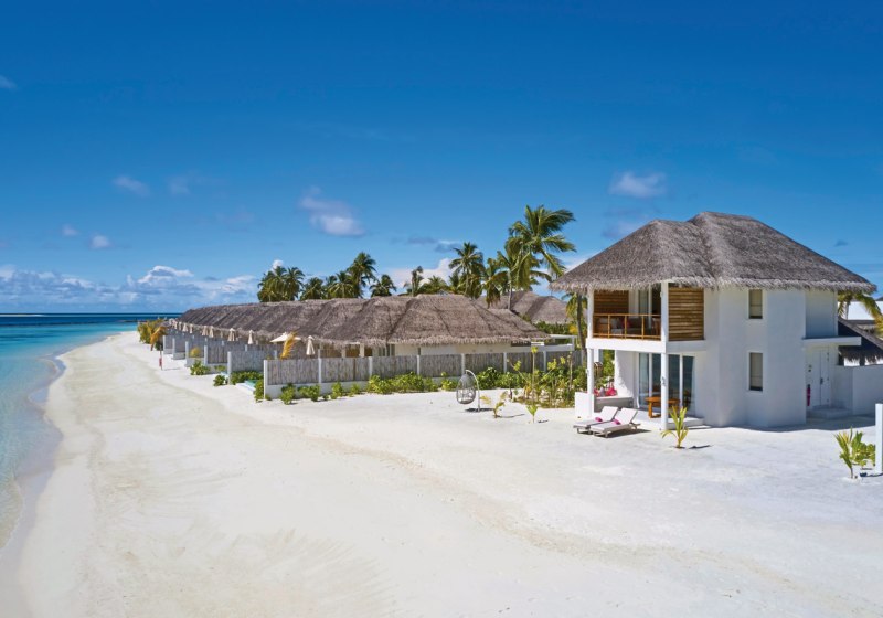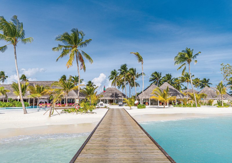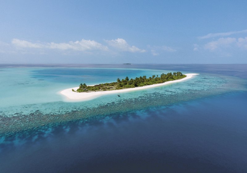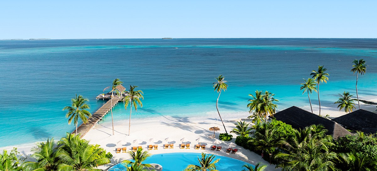 Ihr reist per Wasserflugzeug an, die Transferzeit beträgt rund 45 Minuten. Die Insel liegt im Dhaalu-Atoll, mit einem Hausriff an der Ostseite, das etwa 200 Meter vom Strand entfernt ist. So kombiniert Ihr kurze Wege ins Wasser mit klarer Orientierung: Strand vor der Tür, Riff in Sichtweite, Ruhe und Struktur inmitten des Atolls.