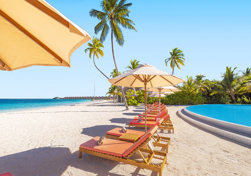 - Strandkomfort: Strand mit Liegestühlen und Sonnenschirmen klar strukturiert.