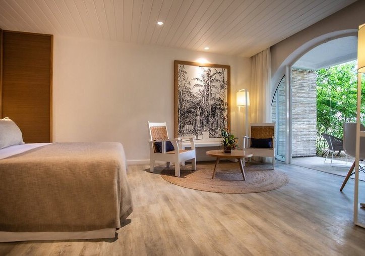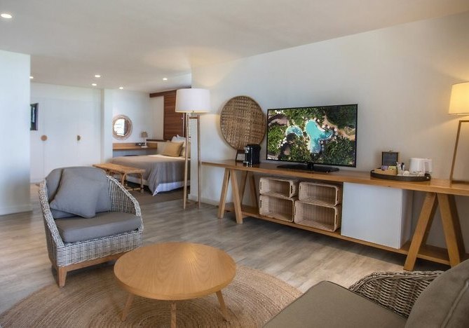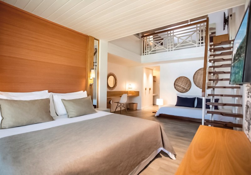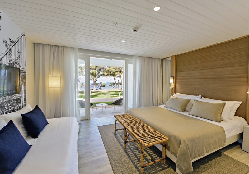 Komfortdetails wie Klimaanlage, Minibar, Kaffee- und Teezubereiter, Bademantel und Hausschuhe ergänzen. Je nach Kategorie sind Doppel-, Queen-, King- oder Einzelbetten verfügbar, teils mit Schlafsofa und Sitzecke. Meerblick- oder Gartenblick-Optionen setzen Akzente, Familienzimmer schaffen zusätzlichen Raum.