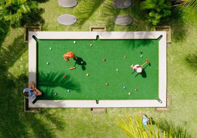 - Vier Pools: Mehrere Außenpools mit Sonnenterrassen und Gartenflächen.
