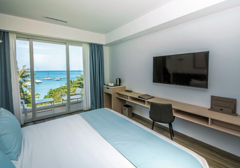 Die 38 Zimmer verteilen sich auf zwei Etagen und bieten je nach Kategorie Meer- oder Bergblick. Ihr wählt zwischen Queensize-Bett, Kingsize-Bett oder zwei Einzelbetten. Standard sind Dusche oder Badewanne, Föhn, Kosmetikartikel, Safe, Minibar sowie Kaffee-/Teezubereiter. Balkon oder Terrasse sind vorgesehen, dazu Sitzbereich und Schreibtisch. Highlight: Zimmer mit Wahl zwischen Meer- und Bergblick.