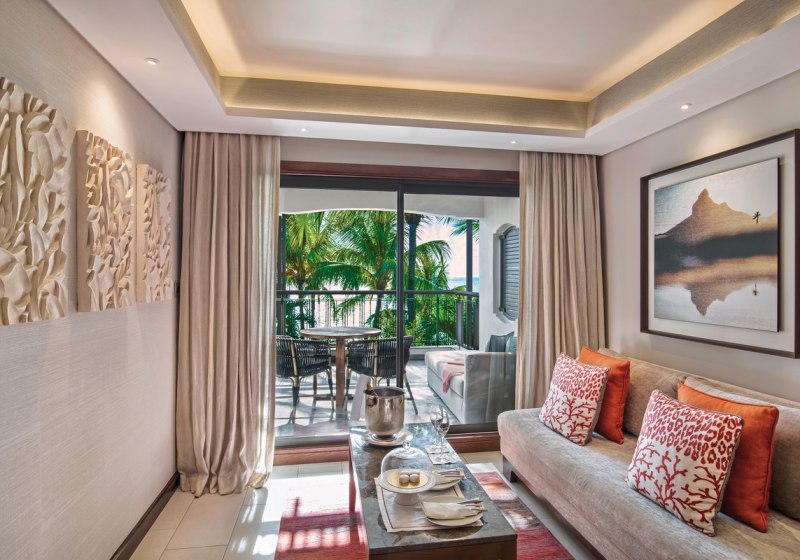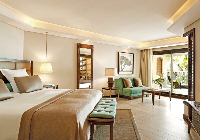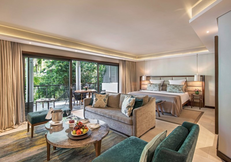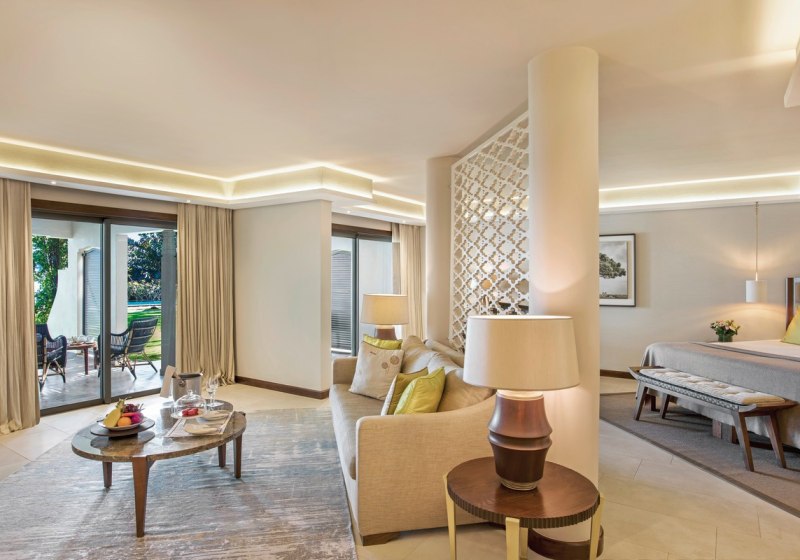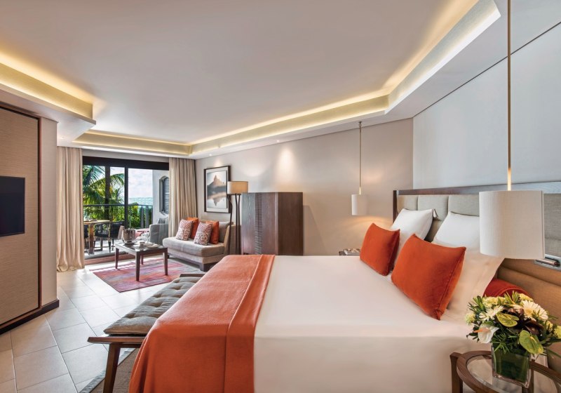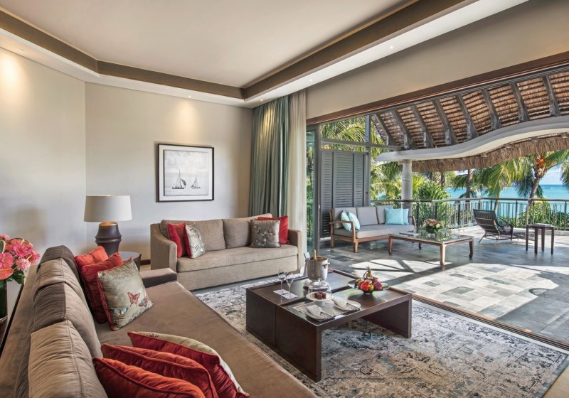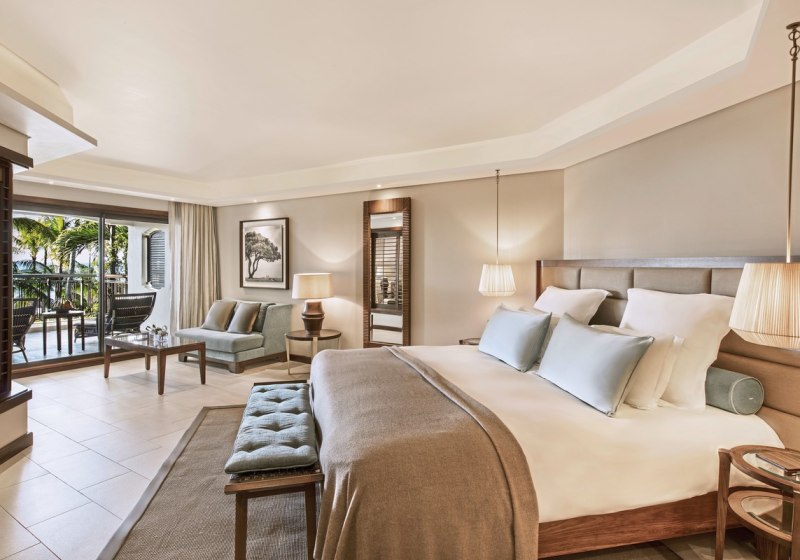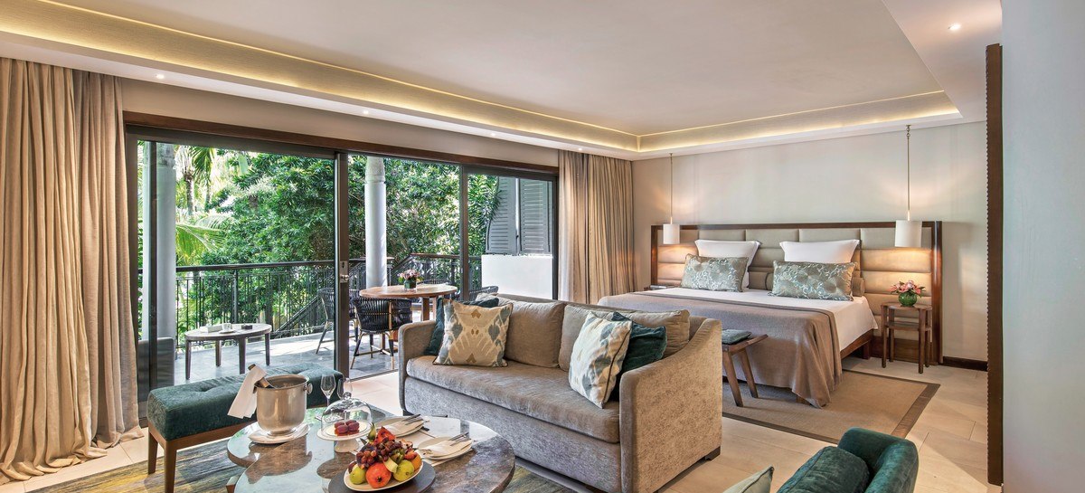 69 Suiten, alle mit Meerblick – das ist die klare Zimmeridee des Royal Palm Beachcomber Luxury. In der Juniorsuite auf etwa 60 Quadratmetern entspannt Ihr mit Kingsize‑Bett, Badewanne, separater Dusche/WC und begehbarem Kleiderschrank. Klimaanlage, Safe, WLAN, Telefon, Sat‑TV, Kaffee‑/Teezubereiter, Minibar, Sofa sowie Balkon oder Terrasse gehören zur Ausstattung.