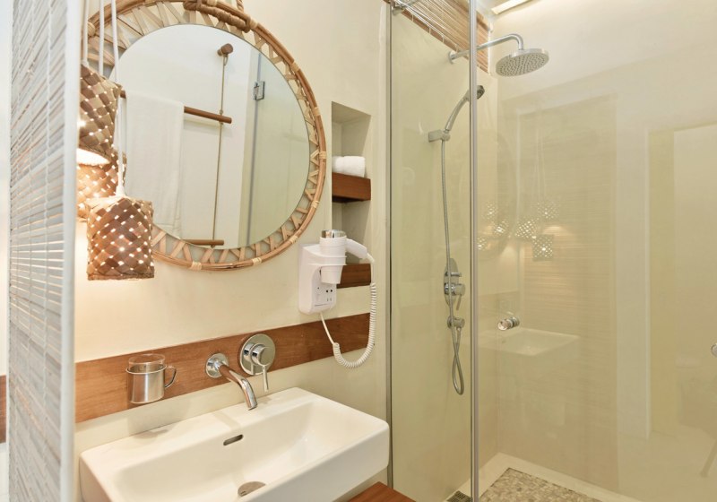 Ihr wohnt in Zimmern mit etwa 25 bis 33 Quadratmetern, ausgestattet mit Dusche, WC, Klimaanlage, Safe, Minibar, Telefon, Sat-TV sowie Tee- und Kaffeekocher. Eine möblierte Terrasse erweitert den Raum nach draußen. Das Design zielt auf Klarheit und Nutzwert, mit allem, was Ihr für entspannte Tage zwischen Strand, Pool und Rooftop braucht.