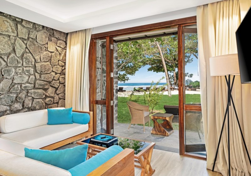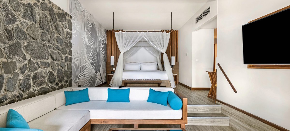 Direkt an der Baie Lazare gelegen, lebt Ihr hier mit dem Rhythmus der Küste. Der Strand ist Euer Vordergarten, Liegen und Sonnenschirme stehen bereit, dazu eine Strandbar. Berge rahmen die Bucht, die Lagune liegt ruhig vor Euch – ein klarer Fixpunkt für entspanntes Baden und kurze Wege zwischen Meer, Pool und Restaurant. Die Anlage verteilt sich flach und gut orientierbar.