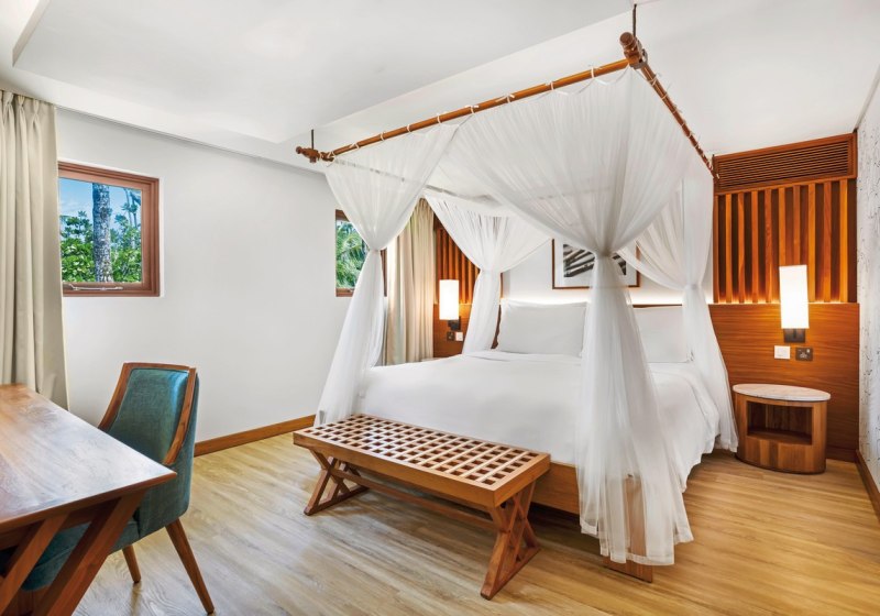 Zimmer mit ca. 46 m², Balkon oder Terrasse und Blick auf Berge und Lagune bieten Raum und klare Abläufe. Spa, Tennis, Paddle-Tennis, Fitness und Wassersport schaffen Abwechslung. Für eure perfekten Ferien auf Mahé wirkt das Setup schlüssig und gut organisiert.