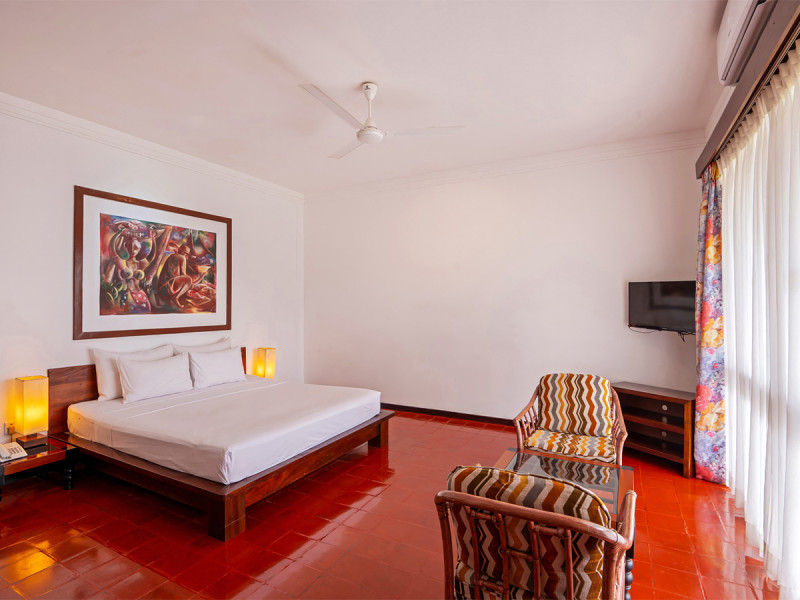 Die Zimmer setzen auf funktionalen Komfort: Klimaanlage und Deckenventilator, Sat-TV, Telefon und Safe gehören ebenso dazu wie Bad oder Dusche/WC. Viele Einheiten öffnen sich auf Balkon oder Terrasse, teils mit Gartenbezug, was den Übergang zwischen Innen- und Außenbereich angenehm macht.