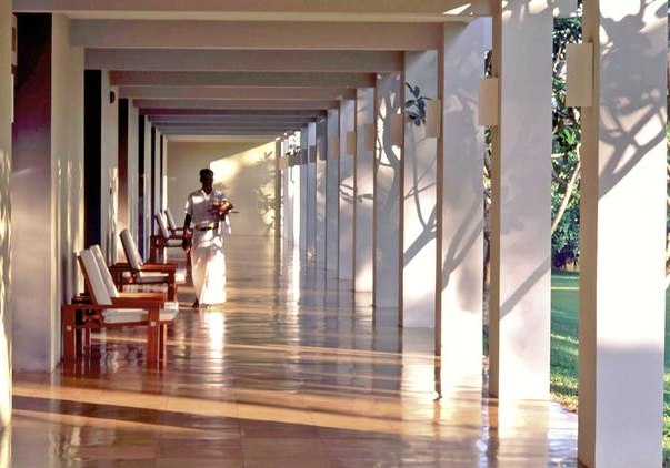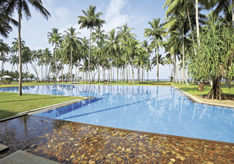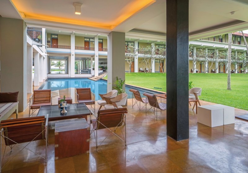 In The Blue Water Hotel lebt Ihr den direkten Strandmoment: Wadduwa liegt vor der Tür, der Indische Ozean rahmt Eure Tage. Das Haus wurde vom renommierten Architekten Geoffrey Bawa gestaltet, was der Anlage eine klare, wohldurchdachte Formsprache verleiht. Weitläufige Außenbereiche, ein großer Pool und viel Grün prägen die Atmosphäre.