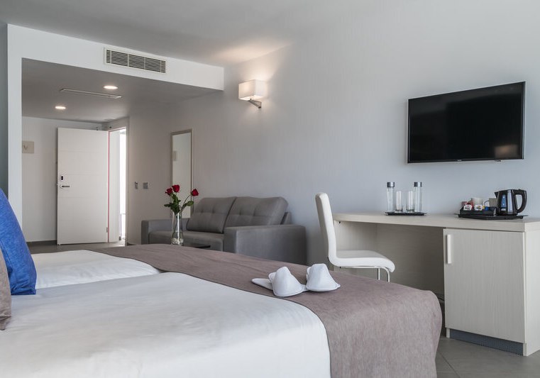 • Klimaanlage • Balkon (je nach Zimmerkategorie) • Kühlschrank • Haartrockner • Kochnische • Mikrowelle • Minibar (gegen Gebühr) • Safe • Meerblick (je nach Zimmerkategorie: seitlich) • Schlafsofa • Kaffee-/Teezubereiter • Terrasse • Fernseher (Sat-TV) • WiFi • Backofen
