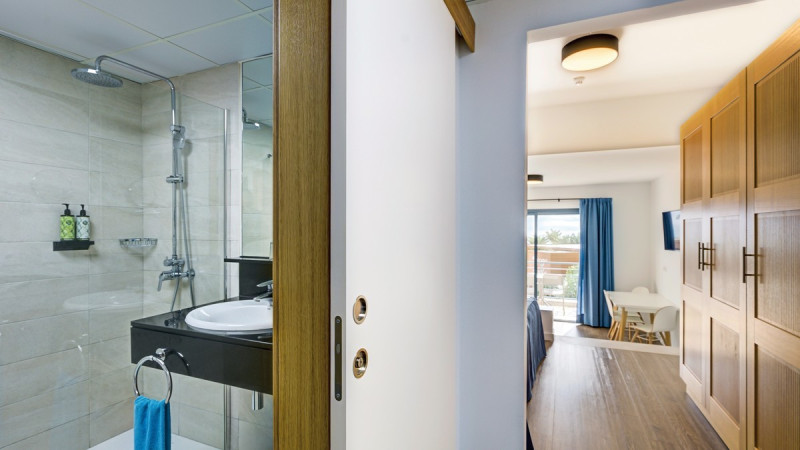 Ihr wohnt in Studios oder Appartements mit einem separaten Schlafzimmer. Die Wohneinheiten sind 2022 renoviert und auf praktische Aufenthalte ausgelegt: Twin-Betten, Kitchenette beziehungsweise Küche mit Herd, Kühlschrank und Mikrowelle, dazu Wasserkocher sowie Kaffee-/Teezubereiter. Balkon oder Terrasse öffnet den Blick in Gartenbereiche oder – je nach Kategorie – zum Meer.