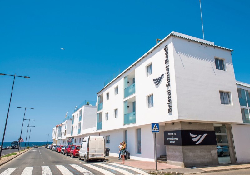Bristol Sunset Beach empfängt Euch am Rand von Corralejo in einer überschaubaren Anlage mit 70 Wohneinheiten, aufgeteilt in mehrere dreistöckige Gebäude. Das Herzstück ist die Dachterrasse mit Chill-out-Zone und Meerblick. Hier sitzt Ihr über den Dächern, spürt die Brise und habt die Abendstimmung der Küste im Blick.