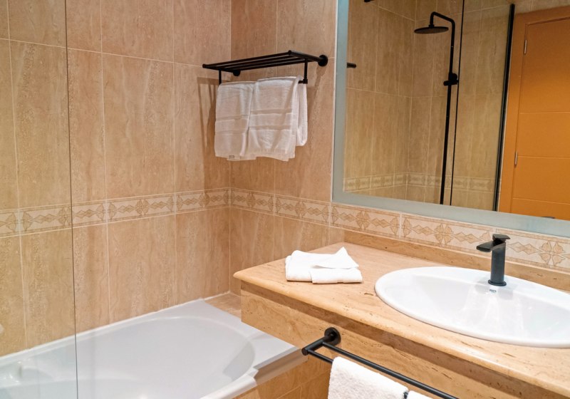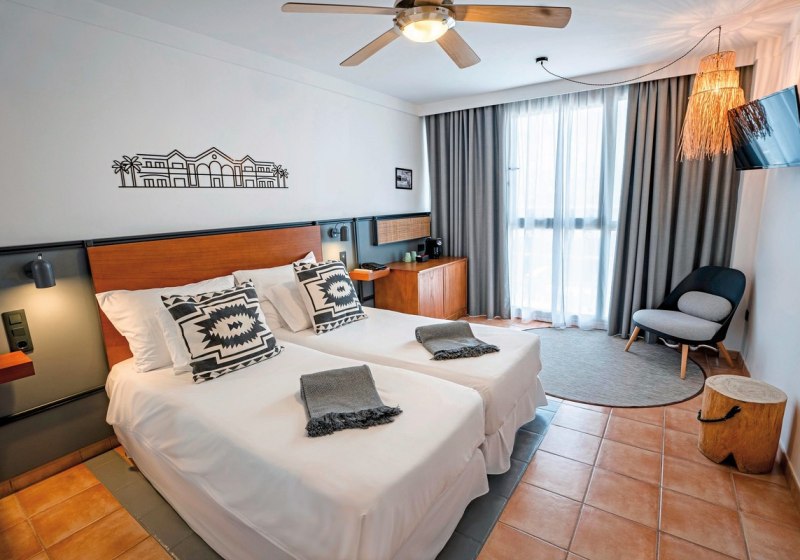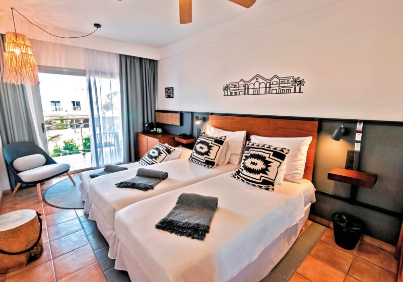 Die 153 Zimmer sind funktional und klar gehalten, mit Fliesenboden und individuell regulierbarer Klimaanlage. Ihr habt stets Balkon oder Terrasse, dazu Safe, kleiner Kühlschrank sowie Tee- und Kaffeezubereitung. Das Bad ist mit Dusche oder Badewanne, WC, Haartrockner und ausgewählten Kosmetikartikeln ausgestattet – Handtuchauswahl inklusive.