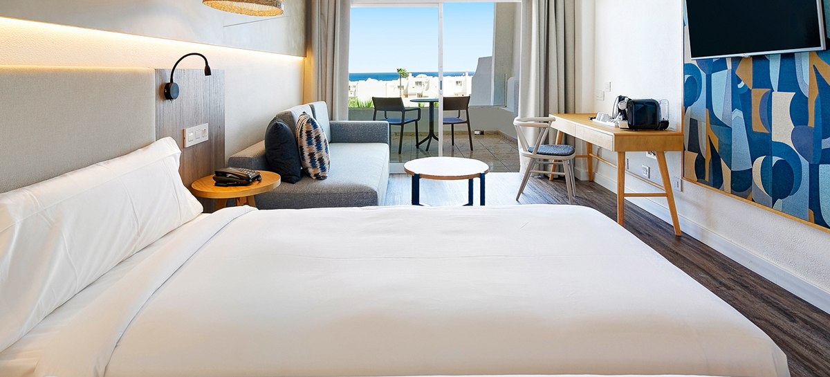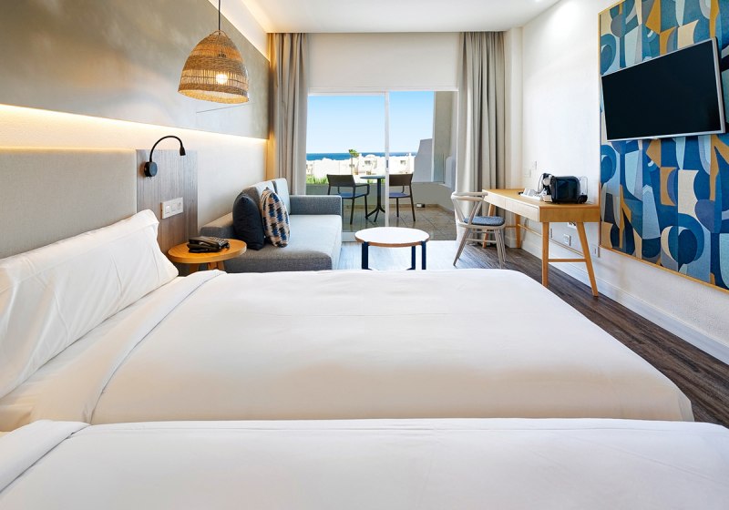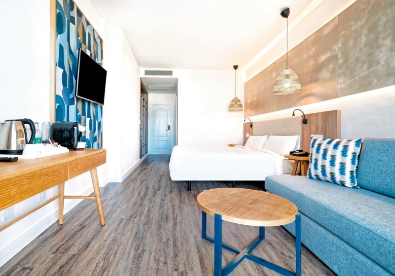 Die Zimmer sind funktional ausgestattet: Klimaanlage, Safe, Sat‑TV sowie Balkon oder Terrasse gehören zum Standard. Dusche/WC, Haartrockner und Kaffee‑/Teezubereiter sind vorhanden; eine Minibar steht gegen Gebühr bereit. WLAN ist inkludiert. Einige Einheiten sind mit direktem Poolzugang buchbar, was den Tagesstart angenehm verkürzt.