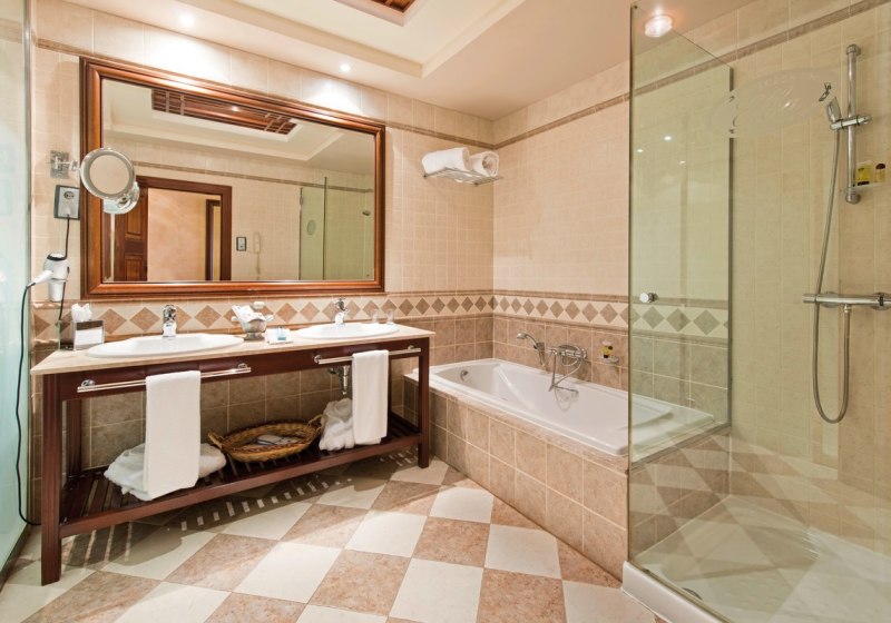 Ihr wählt zwischen Doppelzimmern mit etwa 34 Quadratmetern und Suiten mit rund 57 Quadratmetern inklusive kombiniertem Wohn- und Schlafraum. Viele Details erhöhen den Komfort: zentral gesteuerte Klimaanlage, Deckenventilator, Safe, Sat-TV, WLAN sowie Tee- und Kaffeezubereitung. Minibar ist gegen Gebühr verfügbar.
