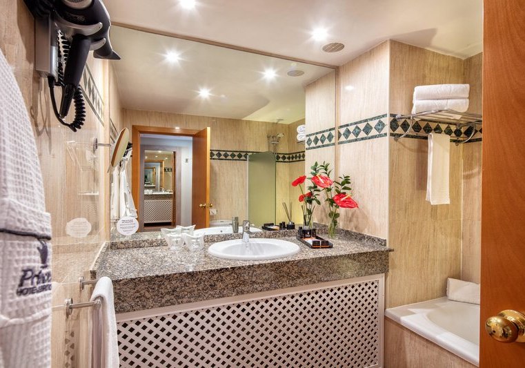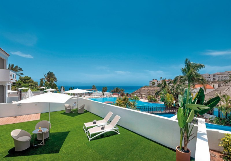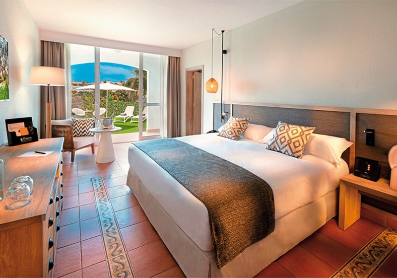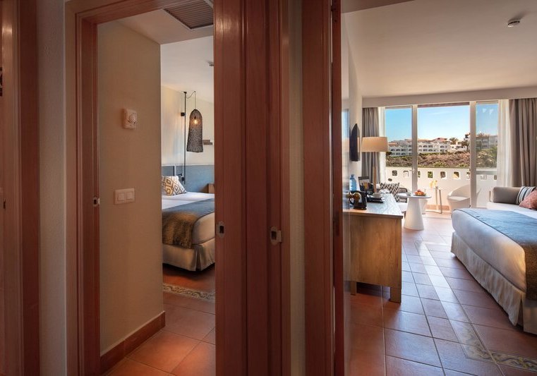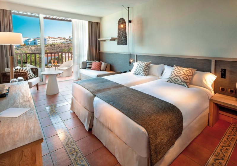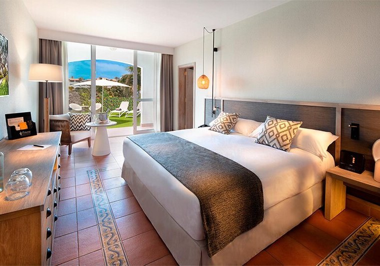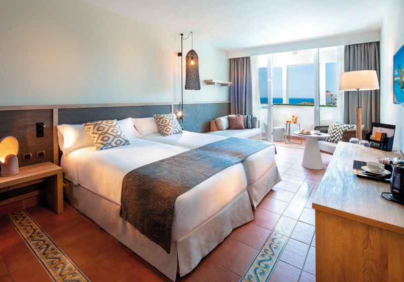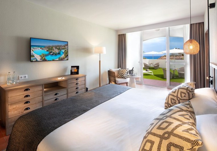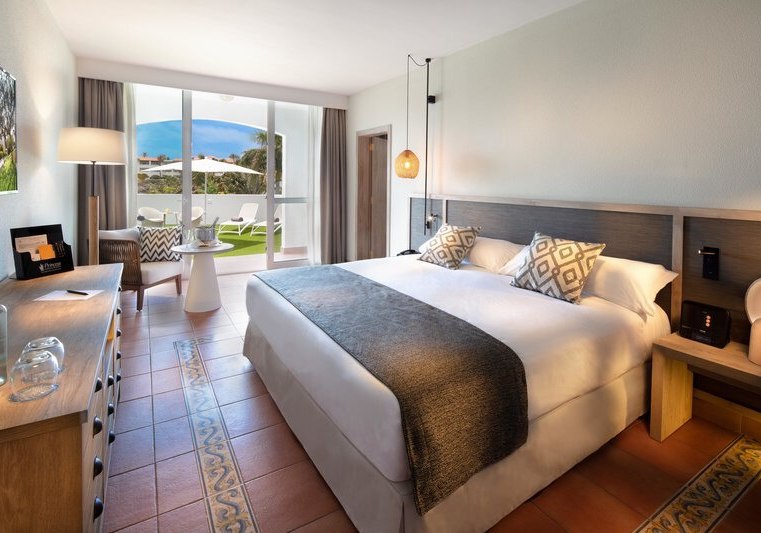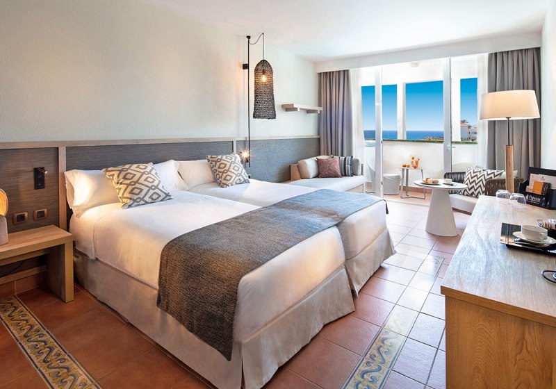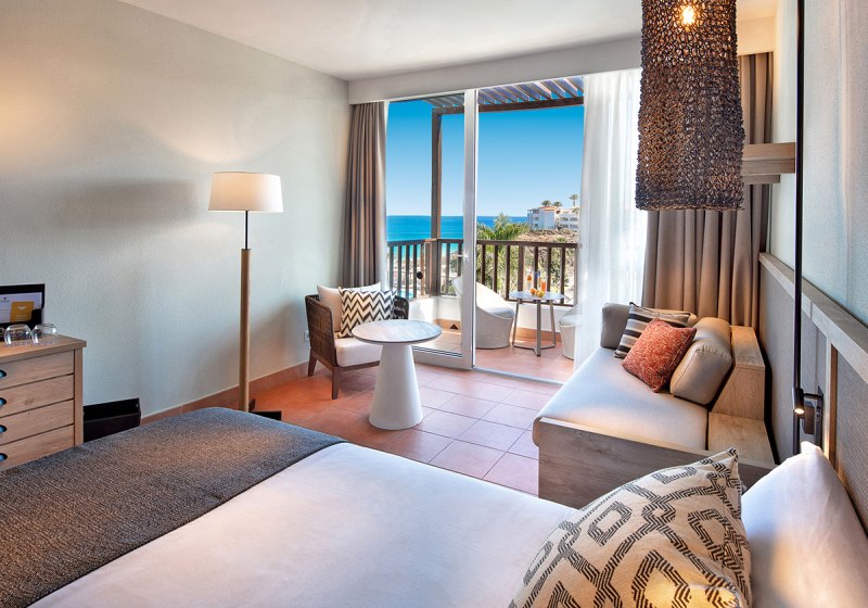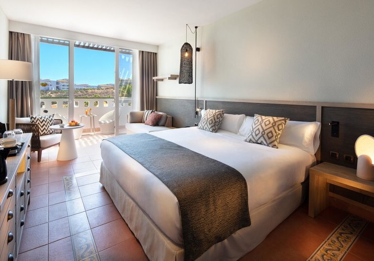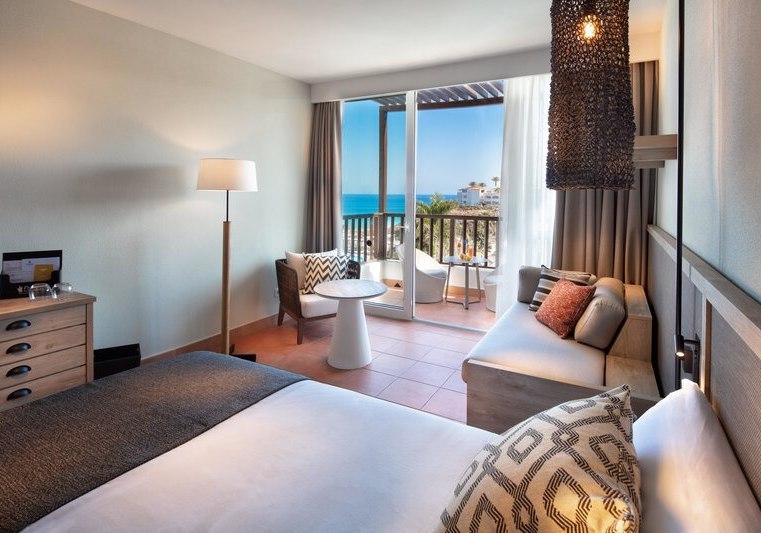 477 Nichtraucher‑Zimmer, darunter Familienzimmer und Suiten, verteilen sich auf mehrere Gebäude. Alle Einheiten verfügen über Balkon oder Terrasse, vielfach mit Blick in Garten- oder Poolbereiche, alternativ zu Bergen, Straße oder Strand. Die Ausstattung umfasst Klimaanlage, TV, WLAN, Safe und Minikühlschrank beziehungsweise Minibar.