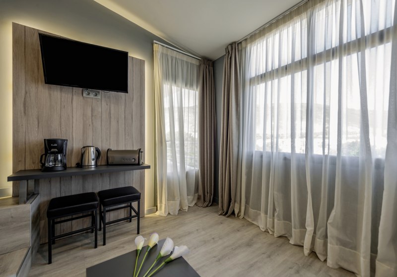 Ihr wählt zwischen Studios und Appartements – jeweils mit Balkon oder Terrasse sowie Küchenzeile. Zur Ausstattung zählen Deckenventilator, Kühlschrank, Herd, Kaffeemaschine, Toaster und Wasserkocher. Sat-TV ist inklusive; ein Safe steht im Zimmer gegen Gebühr bereit. Highlight: Appartements teils mit separatem Schlafzimmer.