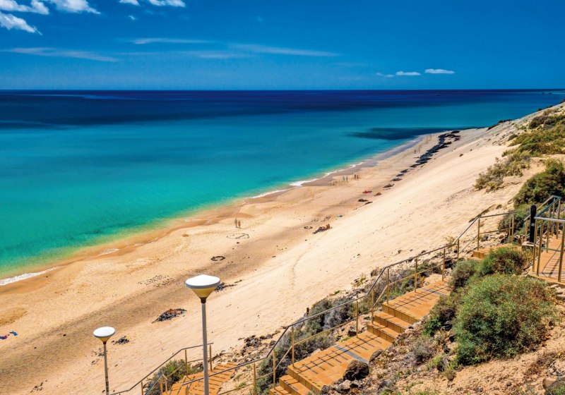 Ihr logiert auf einer Anhöhe direkt oberhalb des Esquinzo-Strandes; der Sand ist über Treppen erreichbar. Zwischen Costa Calma und Jandía gelegen, profitiert Ihr von kurzen Wegen in beide Richtungen. Nach Morro Jable sind es rund 10 Kilometer, zum Flughafen etwa 77 Kilometer – gut planbar für An- und Abreise.