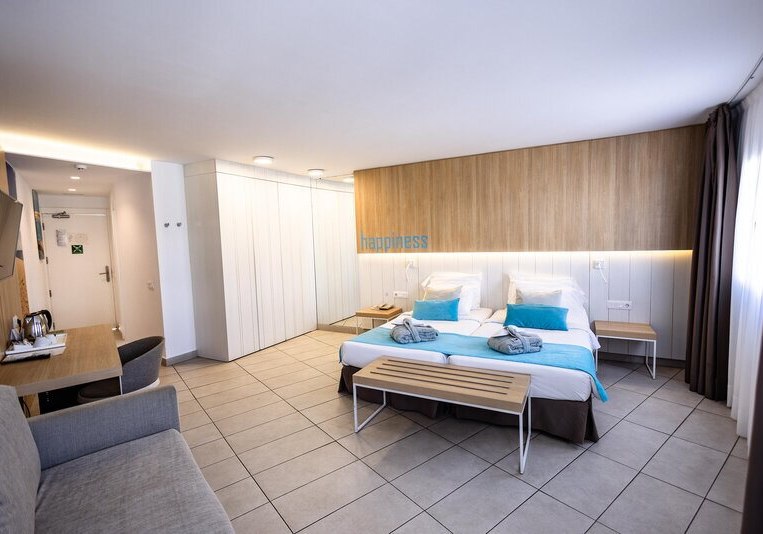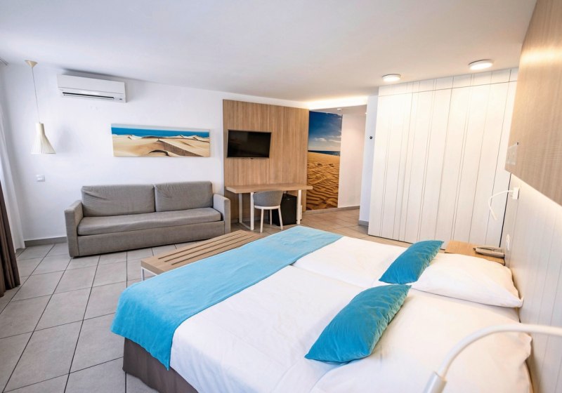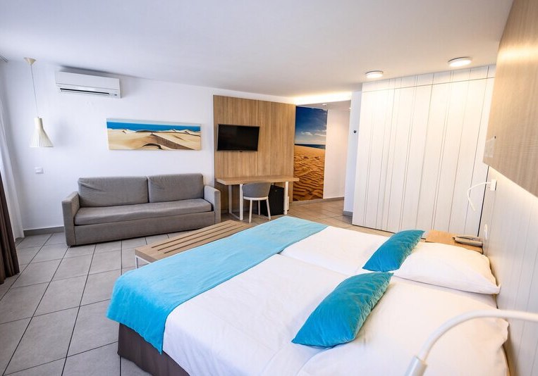 Ein Teil der Superior-Zimmer bietet einen eingeschränkten Meerblick. Zustell- oder Kinderbetten sind laut Angaben möglich und machen die Räume familientauglich. Fliesenboden, Schreibtisch und Sitzgelegenheit erleichtern das Organisieren von Strandtag und Abendprogramm. So entsteht ein klarer, unkomplizierter Rückzugsort – mit frischer Luft auf Balkon oder Terrasse.