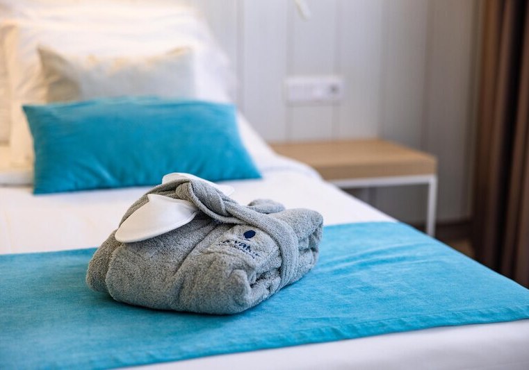 Die Zimmer messen rund 35 Quadratmeter inklusive Balkon oder Terrasse und bieten damit spürbar Platz für einen strukturierten Tagesablauf. Sat-TV, individuell regulierbare Klimaanlage, leere Minibar, Mietsafe und ein Bad mit Dusche/WC sowie Föhn bilden das funktionale Fundament. Je nach Kategorie genießt Ihr Poolblick; in Superior-Zimmern liegen Bademantel und Hausschuhe bereit.