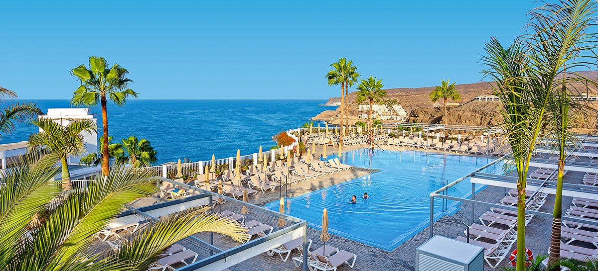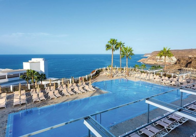 Im Hotel Riu Vistamar wohnt Ihr oberhalb der Steilküste von Puerto Rico/Mogán, mit freiem Blick über den Atlantik. Die Anlage wirkt klar strukturiert und großzügig, Wege führen zu mehreren Ebenen mit Sonnenterrassen und Pools. Familien, Paare und Strandliebende erreichen per Shuttle die Playa Amadores, während Ihr am Abend zwischen Bars, Showprogramm und ruhigen Ecken wählt.