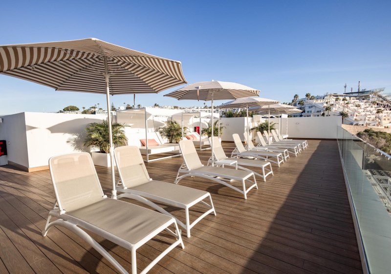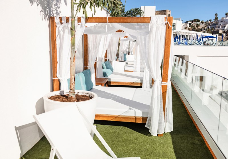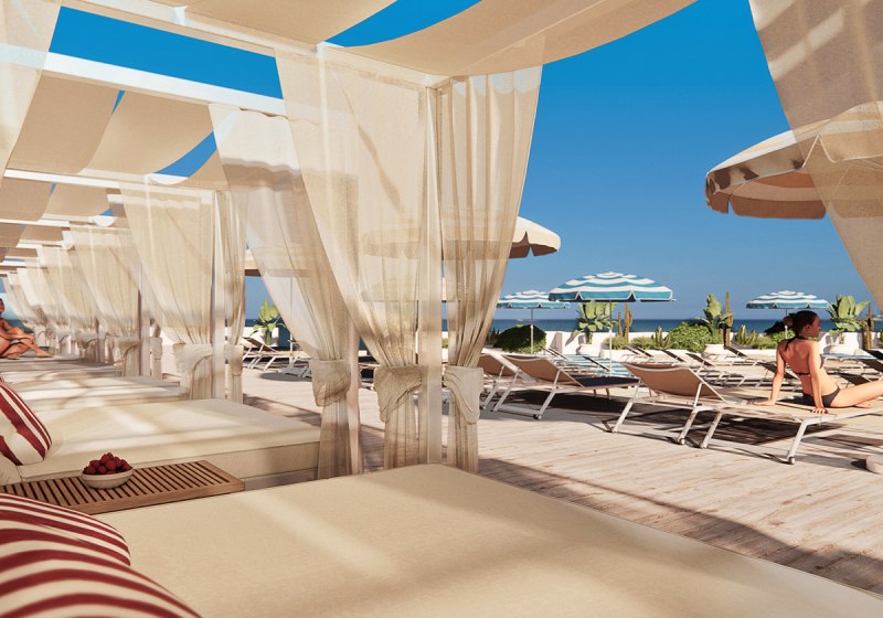 - Sonnenplateaus: Große Terrassen mit Liegen und Schirmen über dem Meer.