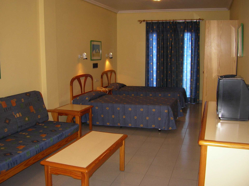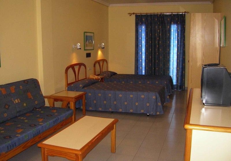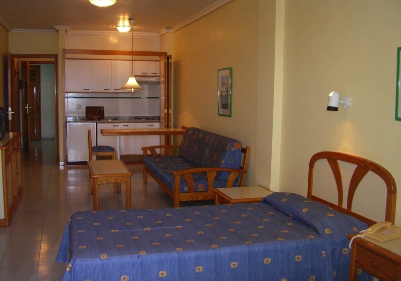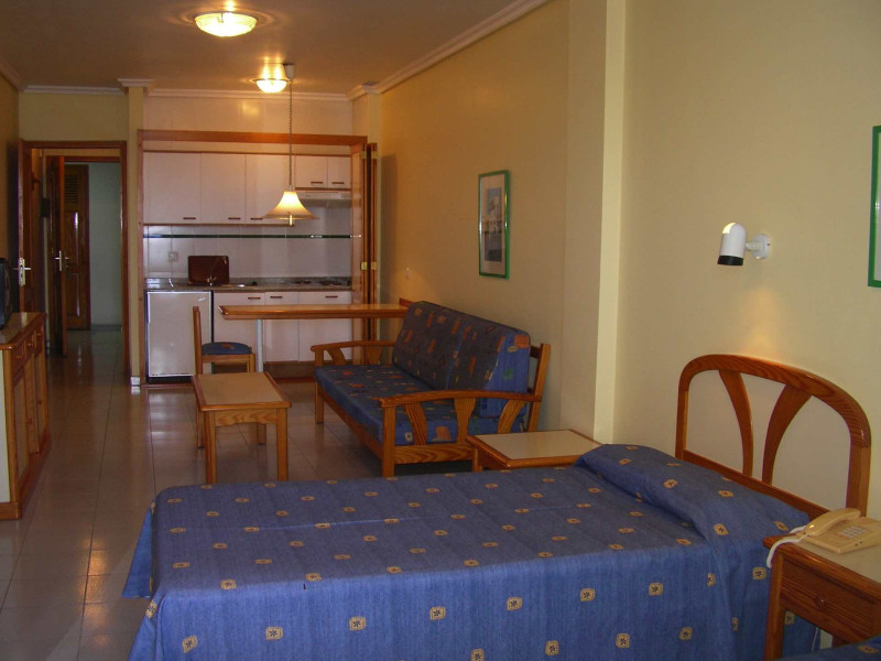 Ihr wohnt in Studios mit Meerblick – ein klarer Vorteil an der Avenida Marítima. Zwei Betten, Tisch mit zwei Stühlen und eine praktische Kitchenette mit Elektroplatte und Kühlschrank strukturieren den Raum. Ein Flatscreen-TV ist vorhanden; deutsche Kanäle sind nicht ausgewiesen. Wertgegenstände verstaut Ihr im Safe.