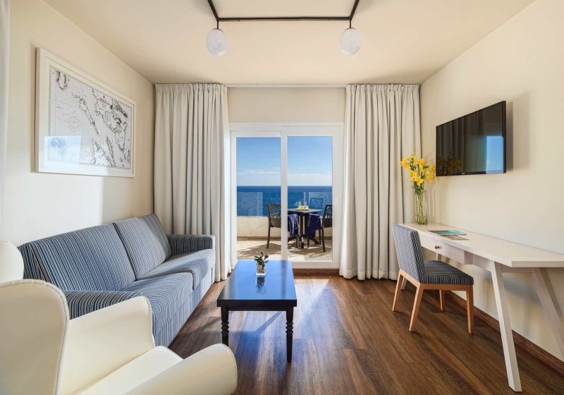 Ihr wohnt mit Balkon oder Terrasse und Blick auf Meer, Pool oder Berge. Zur Ausstattung zählen Klimaanlage, WLAN, Flachbild-Sat-TV, Telefon und Mietsafe. Bad mit Badewanne oder Regendusche, Föhn und Vergrößerungsspiegel; Bademantel und Hausschuhe liegen bereit. Kühlschrank, Minibarbefüllung auf Anfrage und Schreibtisch runden ab.