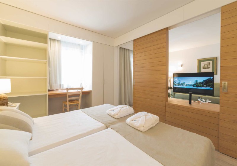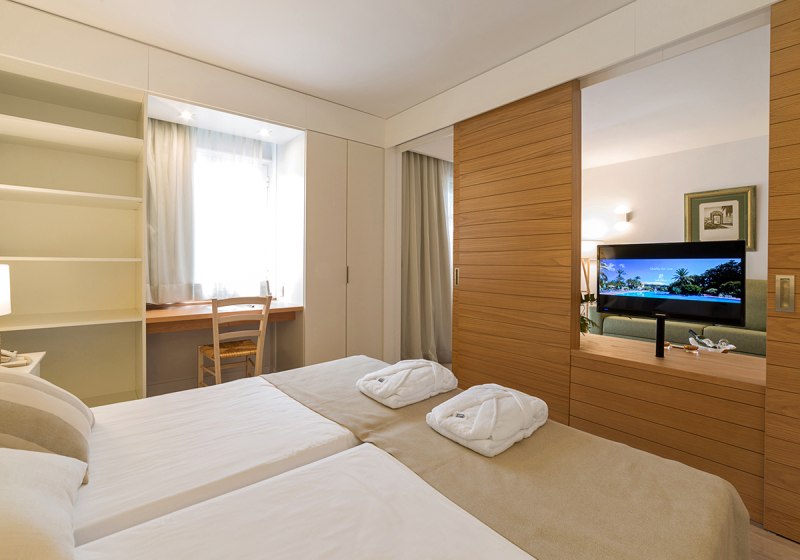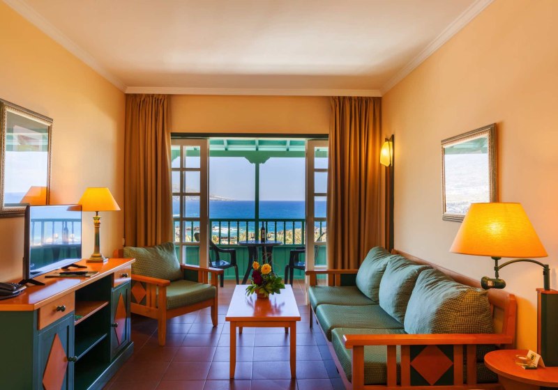 Eure Apartments messen etwa 50 m² und bieten Wohnzimmer, Twin-Betten, Schlafsofa und Schreibtisch. Auf Balkon oder Terrasse mit Außenmöbeln entspannt Ihr im Freien, bei verfügbaren Optionen auch mit Meerblick. Das Badezimmer ist mit Dusche, Pflegeprodukten, Schminkspiegel, Föhn und Bademantel ausgestattet.