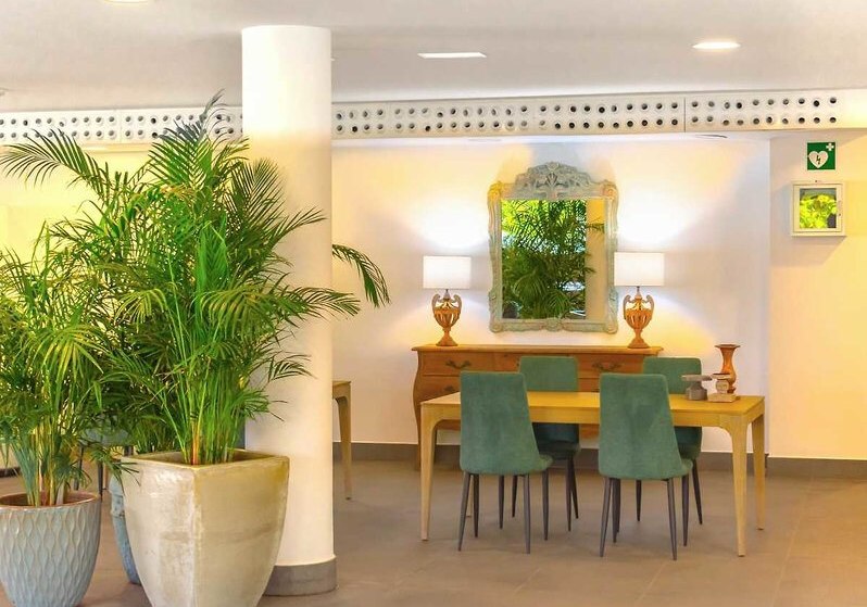 Die öffentlichen Bereiche wirken aufgeräumt und zweckmäßig: 24‑Stunden‑Rezeption, kostenfreies WLAN, Minimarkt und Supermarkt vor Ort sowie kostenfreier Safe und Parkplatz erleichtern Euren Tagesablauf. Zwei Sonnenterrassen mit Liegen und Balibetten fügen dem Ensemble ruhige Zonen hinzu, der Garten rahmt die Wege zwischen Unterkunft, Pools und Restaurant.