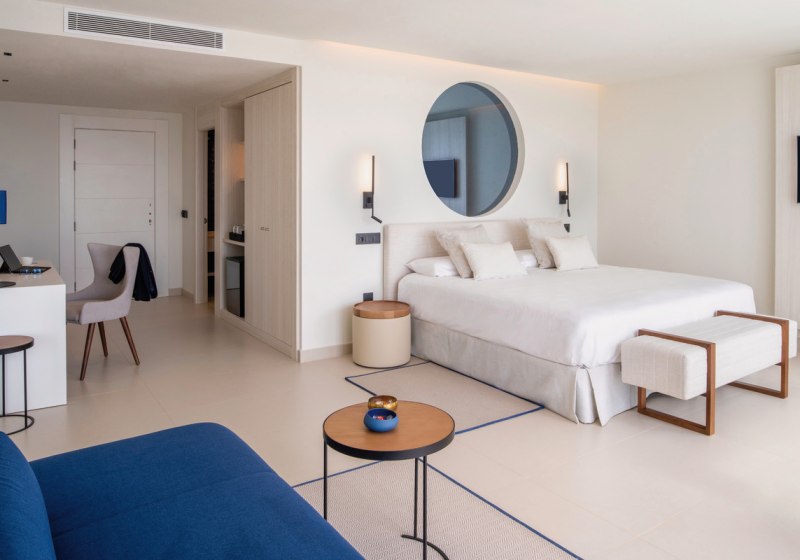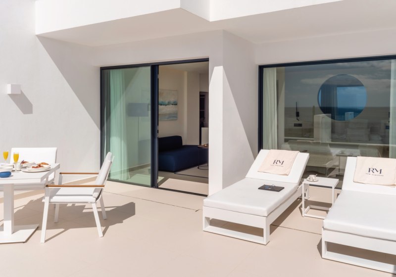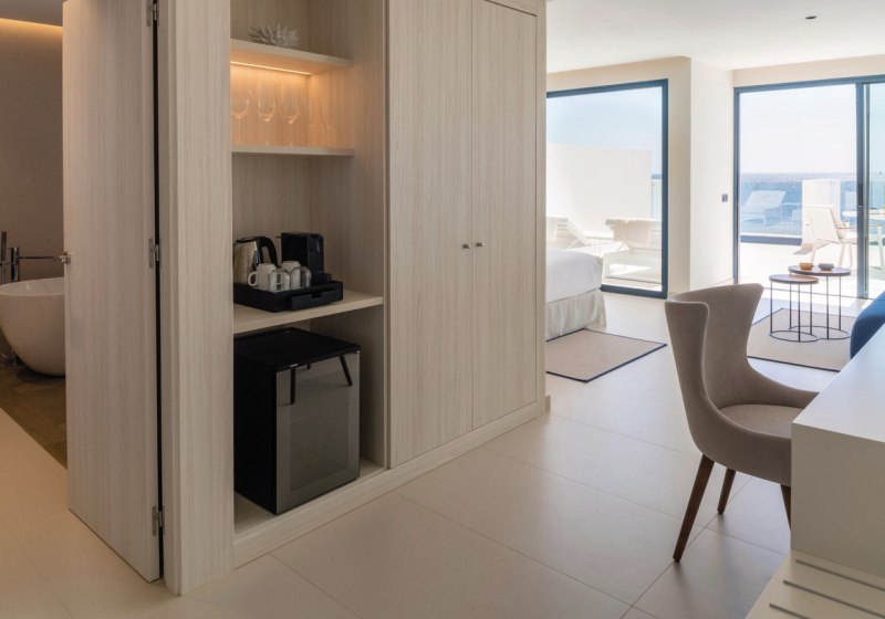 Die Suiten (ca. 45 m²) sind auf Rückzug und Klarheit angelegt. Eine große, möblierte Privatterrasse erweitert den Wohnraum nach draußen; innen verbindet ein offener Wohn- und Schlafbereich Komfort mit Struktur. Ihr schlaft auf Einzelbetten oder Kingsize-Betten. Safe, Kapsel-Kaffeemaschine, Wasserkocher und Minibar stehen bereit, dazu 43-Zoll-Flachbild-TV, Telefon sowie Klima- und Heizfunktion.