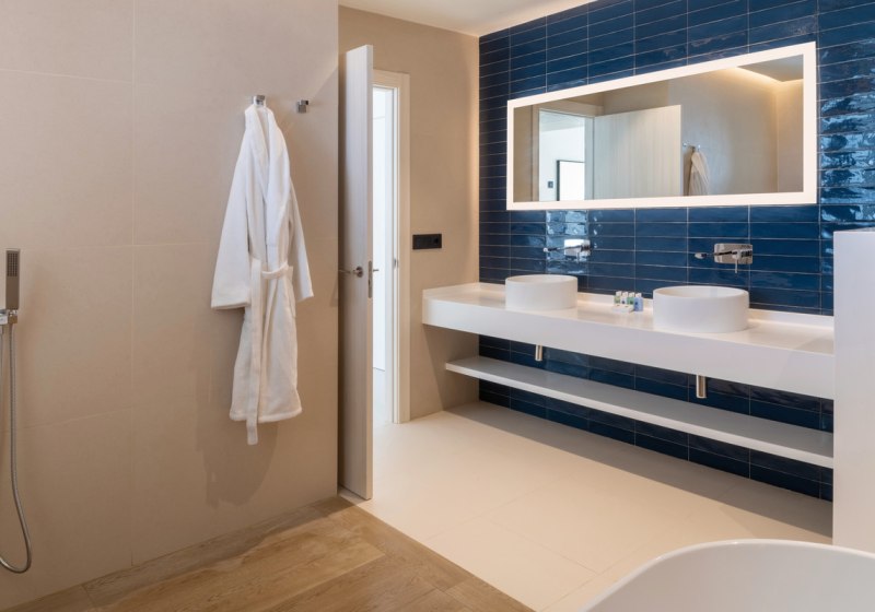 Im Bad erwarten Euch eine freistehende Wanne und eine Regendusche, Doppelwaschbecken, Kosmetikspiegel, Föhn und Pflegeprodukte. Pooltücher, Bademäntel und Slipper liegen für Euch bereit. Royal Suiten bieten Panoramameerblick; weitere Aussichten sind je nach Lage möglich. Die Maximalbelegung liegt bei zwei Erwachsenen, was den ruhigen Charakter des Hauses unterstützt.
