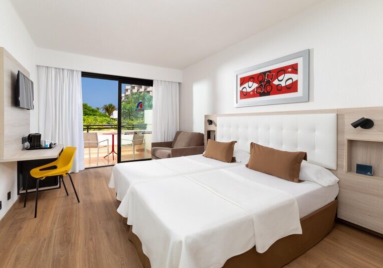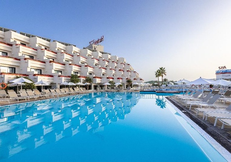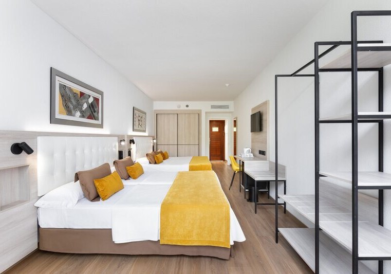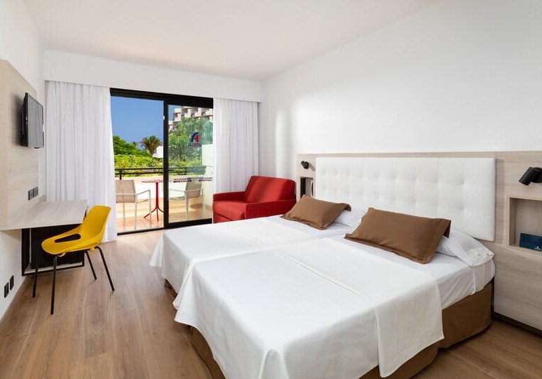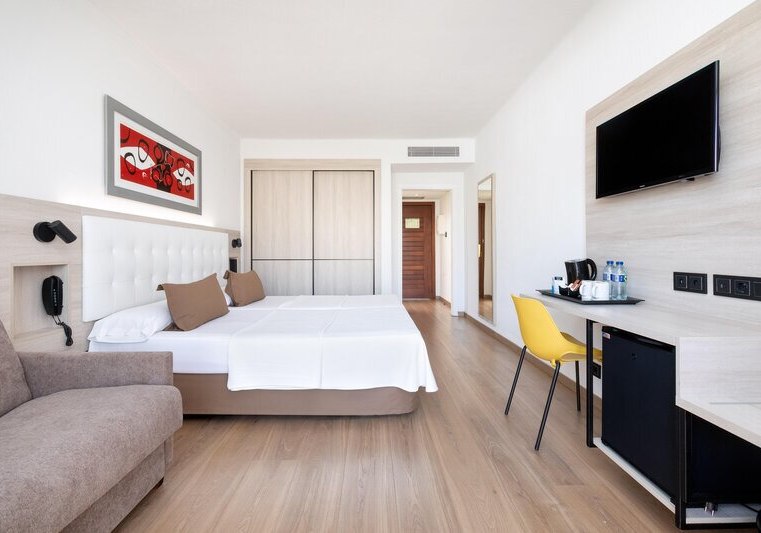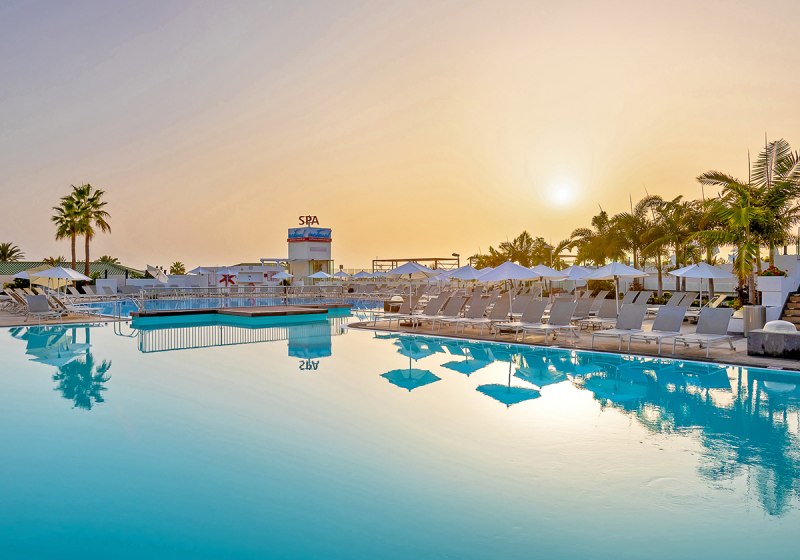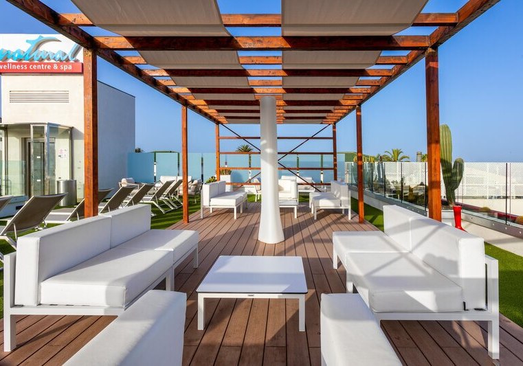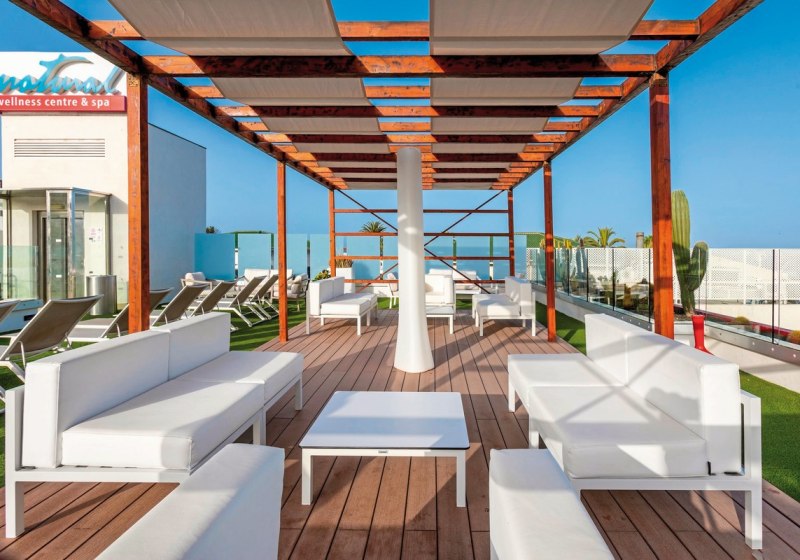 Die öffentlichen Bereiche wirken übersichtlich und funktional: zwei Außenpools, beheiztes Kinderbecken und großzügige Sonnenterrassen mit Liegen und Schirmen. Ergänzend entspannt Ihr auf der Chillout‑Terrasse. WLAN ist im gesamten Hotel und in den Zimmern inklusive, Poolhandtücher gibt es gegen Kaution.