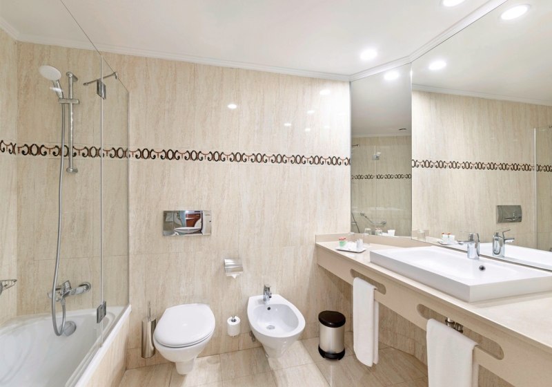 Die Doppelzimmer bieten rund 30 Quadratmeter Platz, Klimaanlage, Sat‑LCD‑TV, Direktwahltelefon, Mietsafe und eine Minibar gegen Gebühr. Bad/WC mit Föhn sowie Balkon oder Terrasse runden die Grundausstattung ab – ideal, wenn Ihr klare Linien und praktikablen Komfort schätzt.