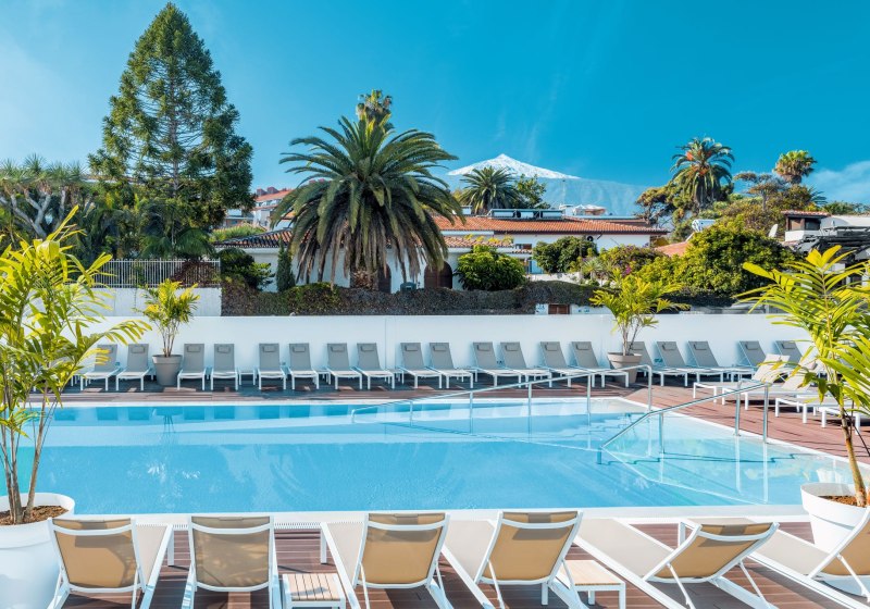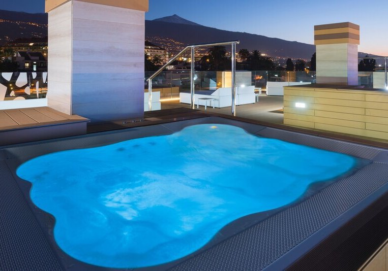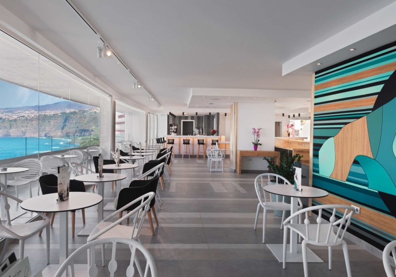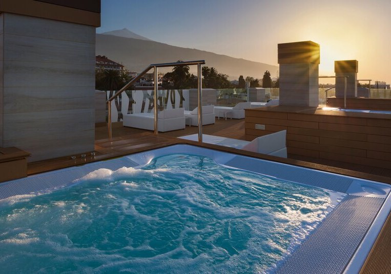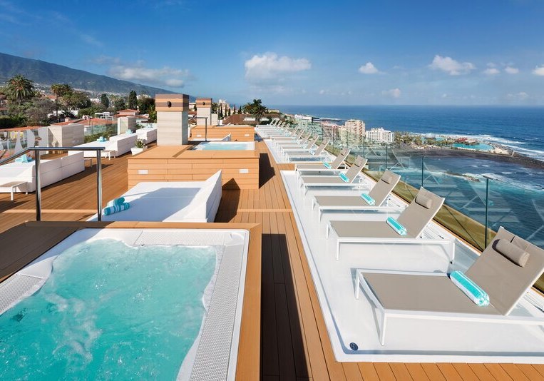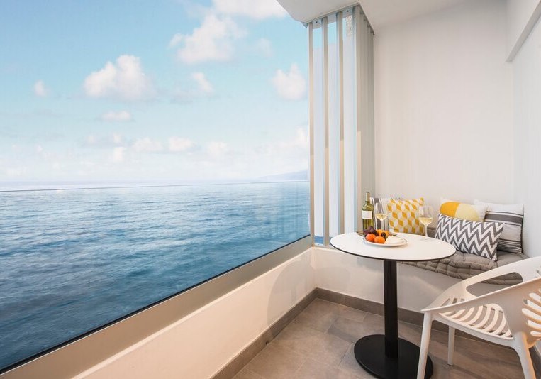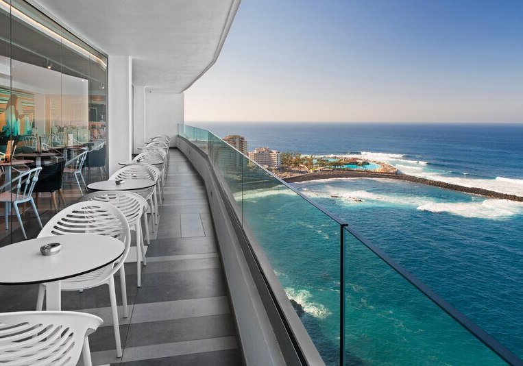 Im Hotel Atlantic Mirage Suites & Spa wohnt Ihr auf einer Felsklippe im Viertel La Paz von Puerto de la Cruz, nur einen angenehmen Spaziergang vom Zentrum entfernt. Das Haus ist Adults-only ab 18 Jahren und richtet sich an Paare und Freundeskreise, die Ruhe mit Meerblick suchen. Alle Zimmer bieten Balkon und Blick auf den Atlantik, dazu klare Linien und durchdachte Details für einen unbeschwerten Aufenthalt. Auf der Dachterrasse erwartet Euch eine Sky Bar mit Whirlpools – ein Ort für den späten Drink über den Lichtern der Stadt.