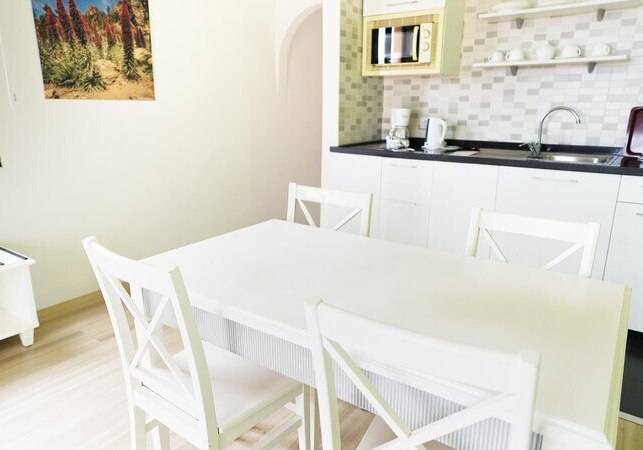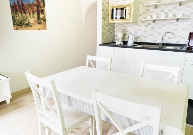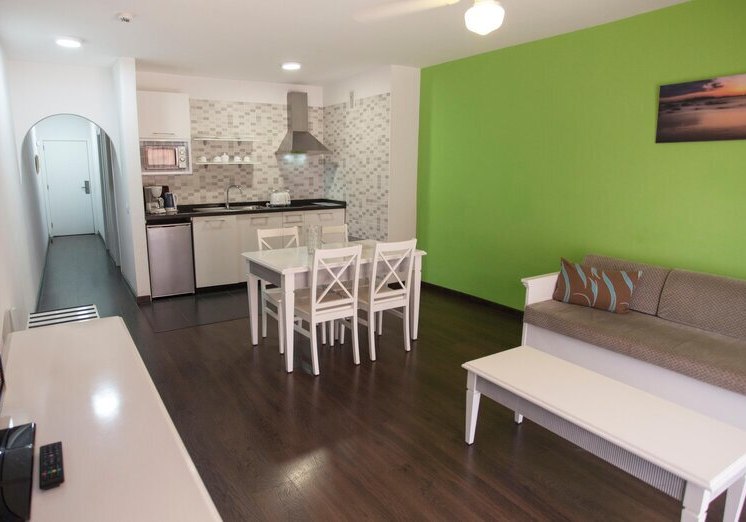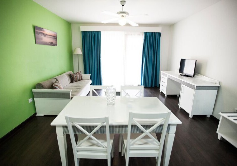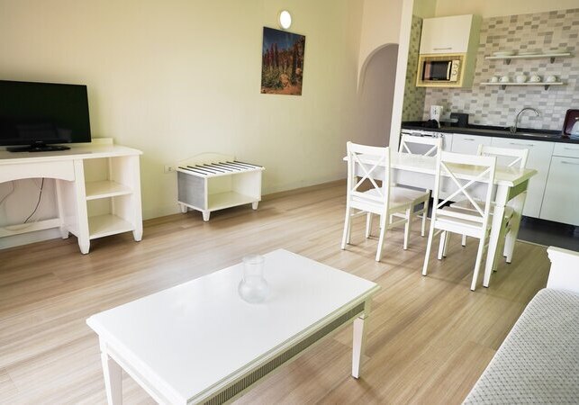 Ihr wohnt in einer Apartmentanlage mit der Ruhe privater Räume und dem Komfort eines Hotels. Wohnzimmer und Essecke gehen in eine Kochnische über; Kühlschrank, Mikrowelle, Toaster, Wasserkocher sowie Kaffee- und Tee-Setup unterstützen flexible Tagesabläufe. Balkon oder Terrasse öffnet den Blick, je nach Lage mit Meer- oder Poolperspektive.