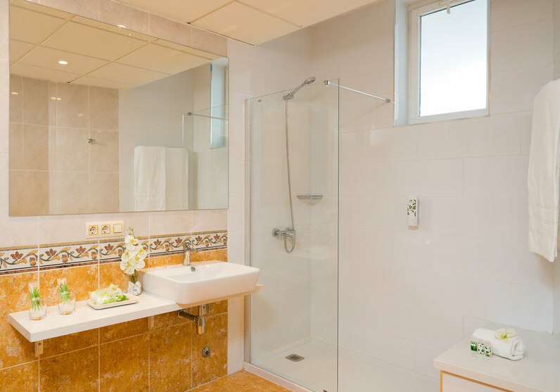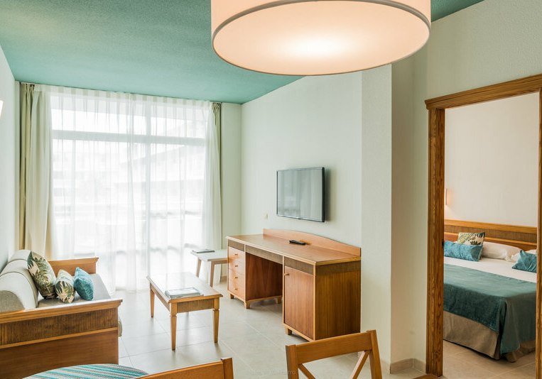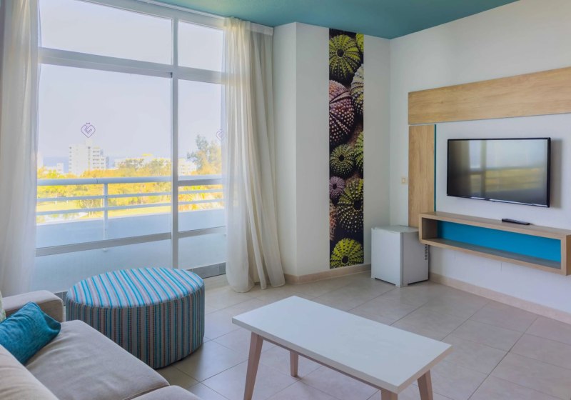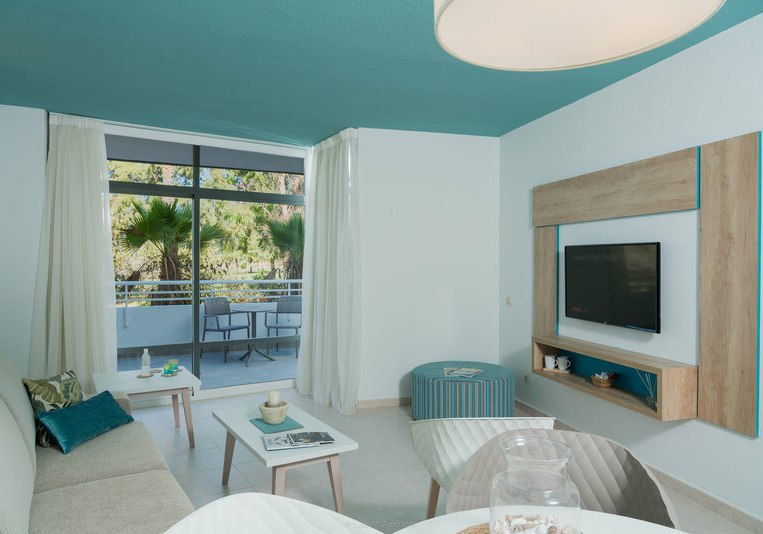 Ihr wohnt in Suiten mit separatem Schlafzimmer und Wohnbereich – viel Platz für einen ruhigen Ablauf. Alle bieten Bad mit Dusche oder Wanne, WC und Bidet, Föhn, Klimaanlage, Telefon, kostenlosen Safe, Kühlschrank, Sat‑TV ohne deutsche Kanäle sowie kostenloses WLAN. Balkon oder Terrasse öffnet den Raum nach draußen.