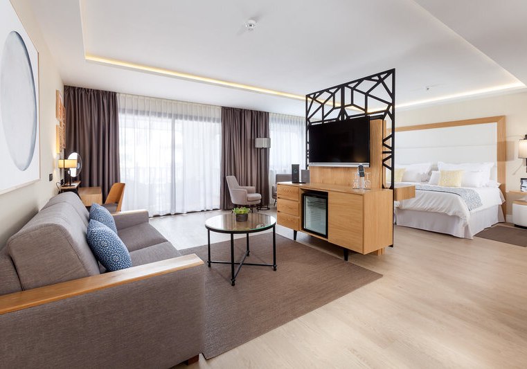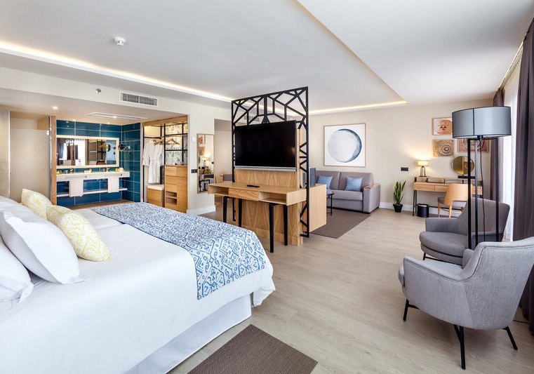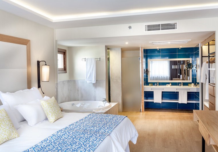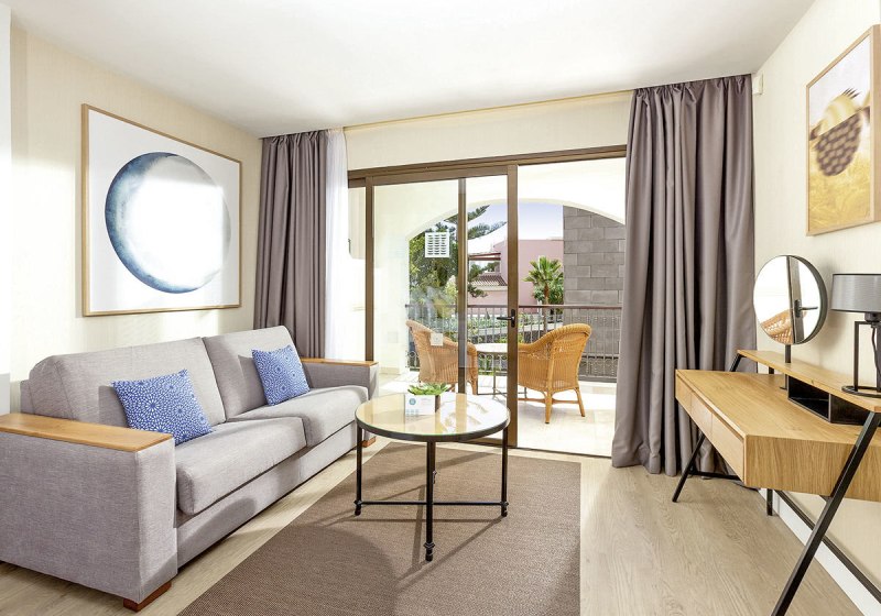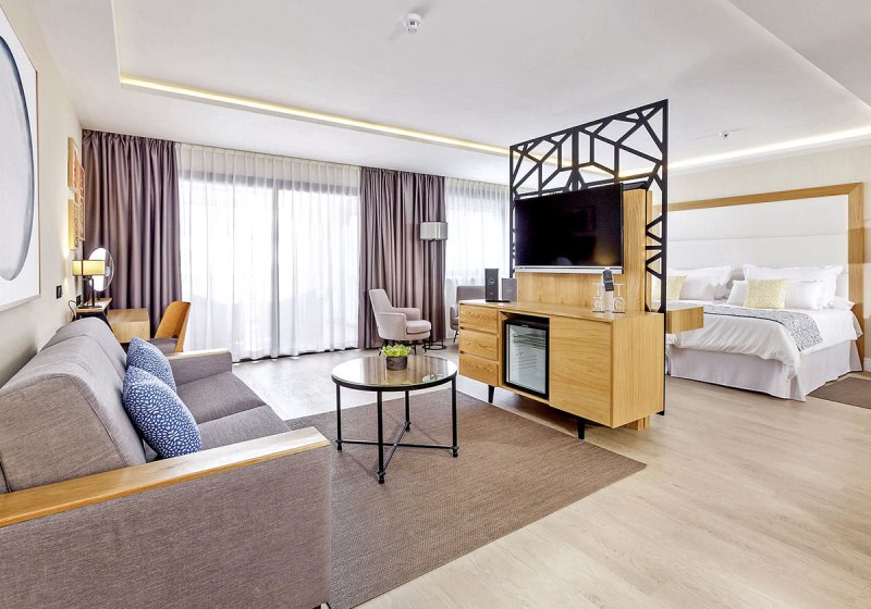 Die Doppelzimmer messen ca. 45 m² und bieten Klimaanlage, 49" Sat-Smart-TV, gratis Safe und WLAN. Ein Schlafsofa, offenes Bad mit separater Wanne, Massage-Dusche sowie Bademantel und Hausschuhe sorgen für Komfort. Balkon oder Terrasse sind möbliert – ideal für eine ruhige Auszeit zwischendurch.