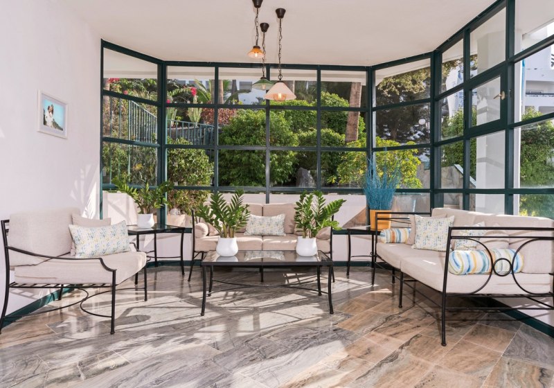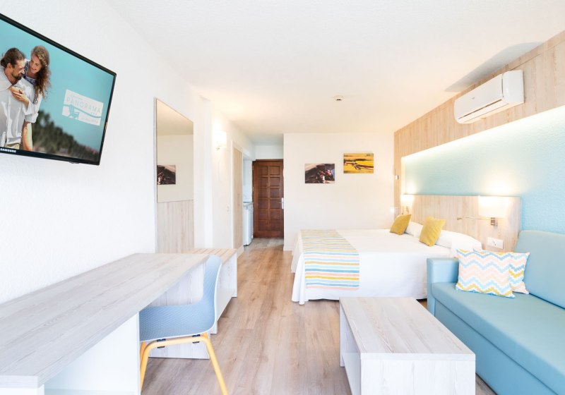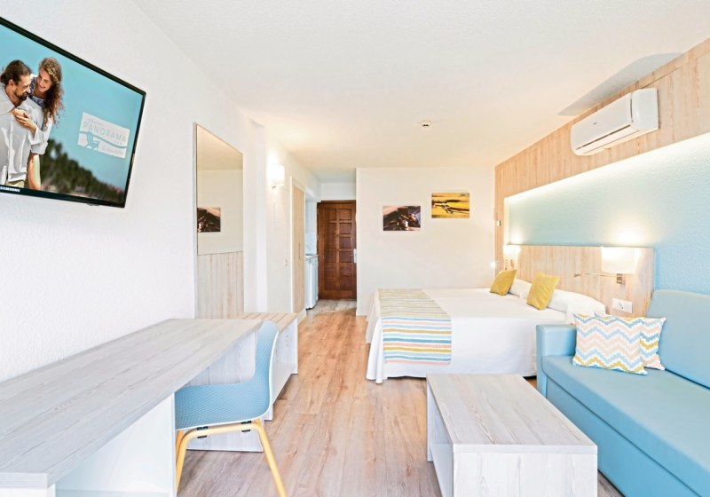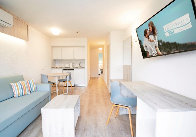 Im Hovima Panorama wohnt Ihr in einem gepflegten Apartmenthotel mit 174 Einheiten auf vier Etagen – entspannt, übersichtlich, mit klarer Struktur. Studios und Appartements geben Euch Raum für eigenes Tempo, die Gemeinschaftsbereiche wirken aufgeräumt und freundlich. Das Haus richtet sich an Strandurlauber und Familien, die kurze Wege schätzen und ihren Tag flexibel gestalten wollen.