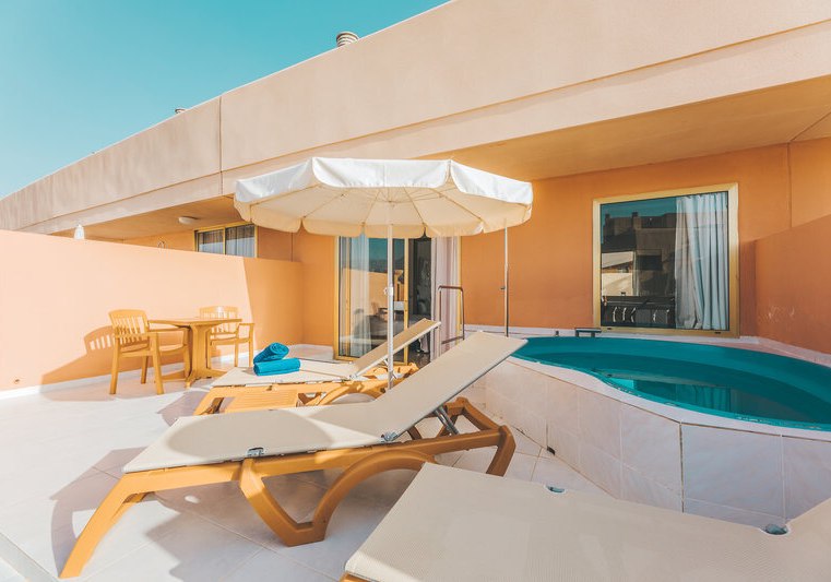 Zimmer mit Balkon oder Terrasse, verlässlicher Basisausstattung und optionalem privatem Plunge Pool bieten Rückzugsraum. Das Spa mit beheiztem Meerwasserpool, die ganzjährig temperierten Pools und das breite Sportangebot runden Euren Aufenthalt in den Ferien ab – klar, nah und komfortabel organisiert.