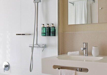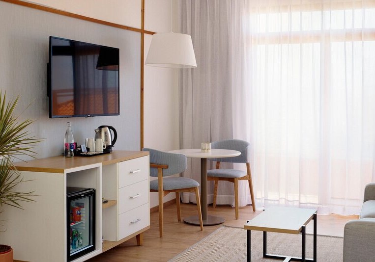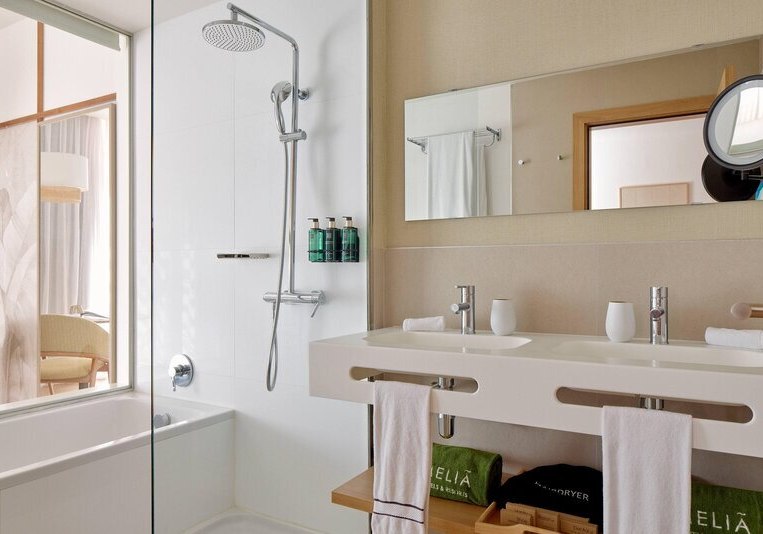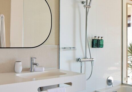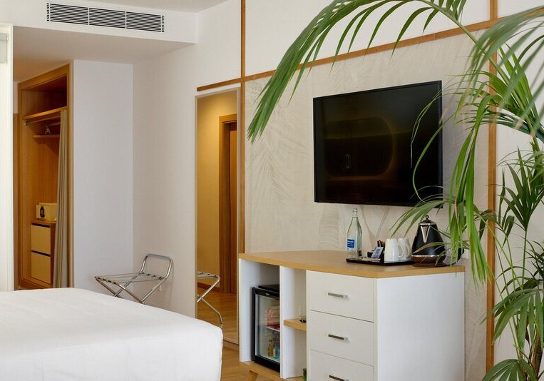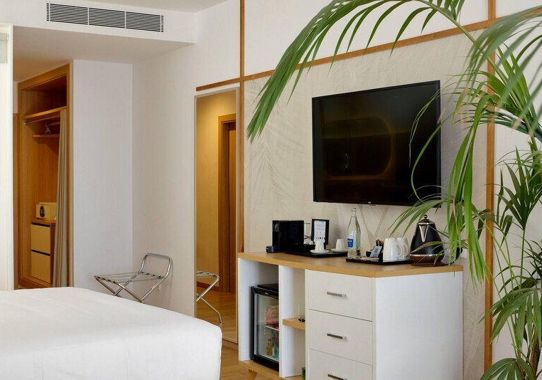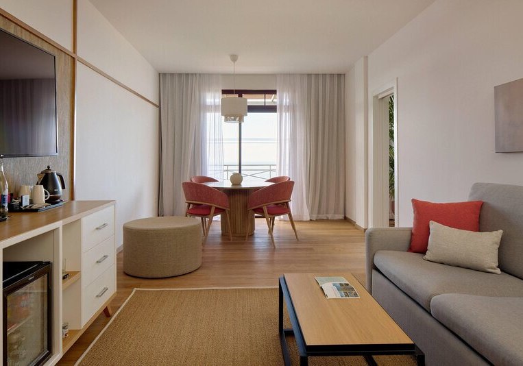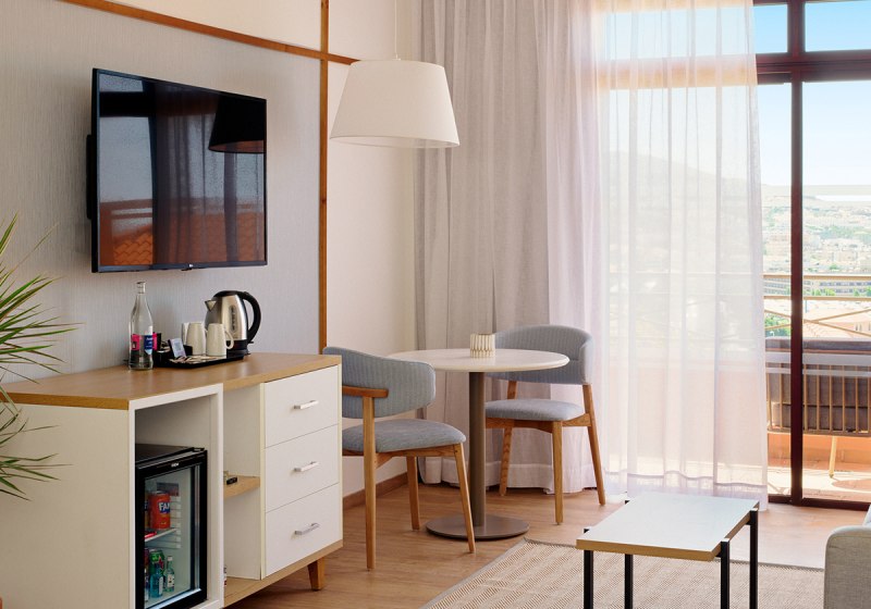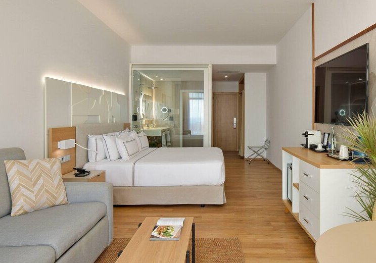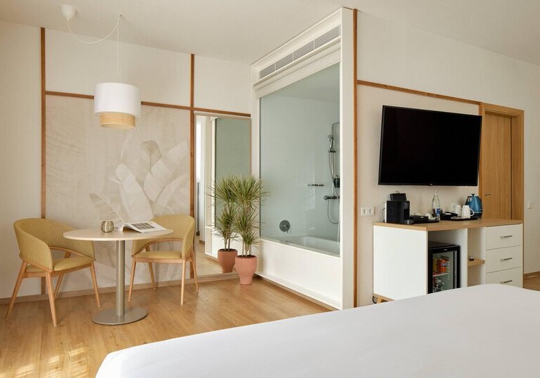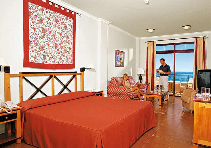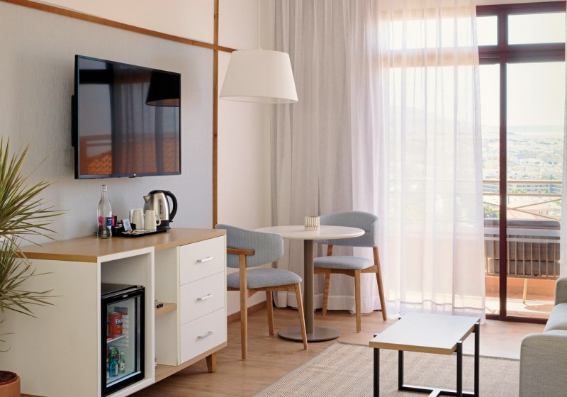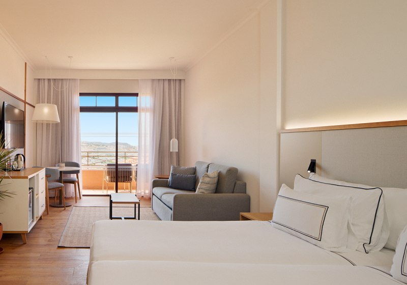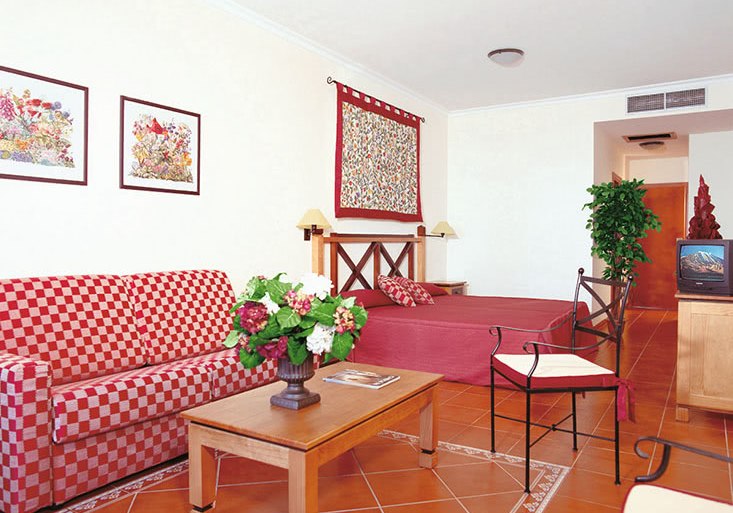 Die Zimmer sind etwa 35 Quadratmeter groß und bieten Balkon oder Terrasse. Ihr nutzt Klimaanlage, Safe, Telefon und Sat-/Flachbild-TV. Das Bad ist mit Dusche, WC und Föhn ausgestattet; die Minibar steht gegen Gebühr bereit. In den Doppelzimmern findet Ihr zudem einen Kaffee-/Teezubereiter.