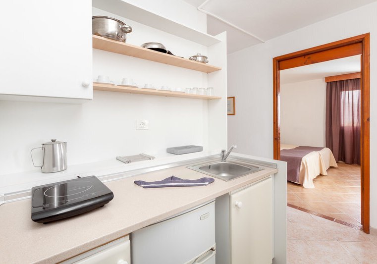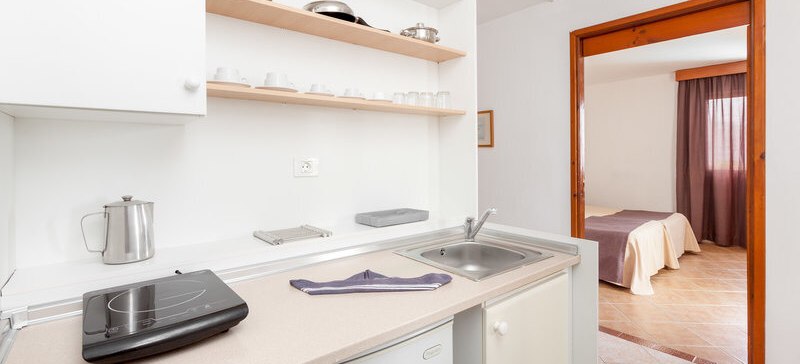 Die Appartements messen etwa 45 m² und ergänzen ein separates Schlafzimmer, ansonsten entspricht die Ausstattung dem Studio. Für Familien stehen Babybetten bereit. So richtet Ihr Euch mit wenigen Handgriffen ein, kocht unkompliziert selbst oder genießt die gastronomischen Angebote im Haus.