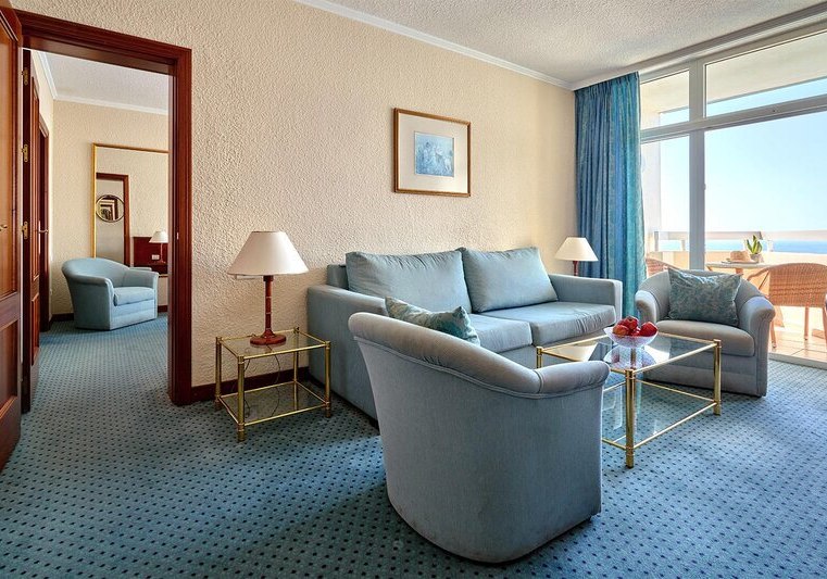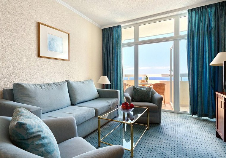 Ihr wählt zwischen ca. 30 m² großen Doppelzimmern und Suiten mit etwa 60 m² samt separatem Wohnraum. Alle bieten Klimaanlage, kostenloses WLAN, Safe, Sat-TV, Telefon, Bad/WC mit Föhn sowie einen möblierten Balkon. Viele Details wie Schreibtisch und Vergrößerungsspiegel erhöhen die Alltagstauglichkeit.