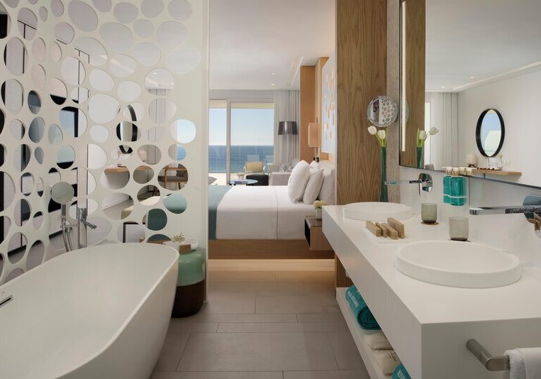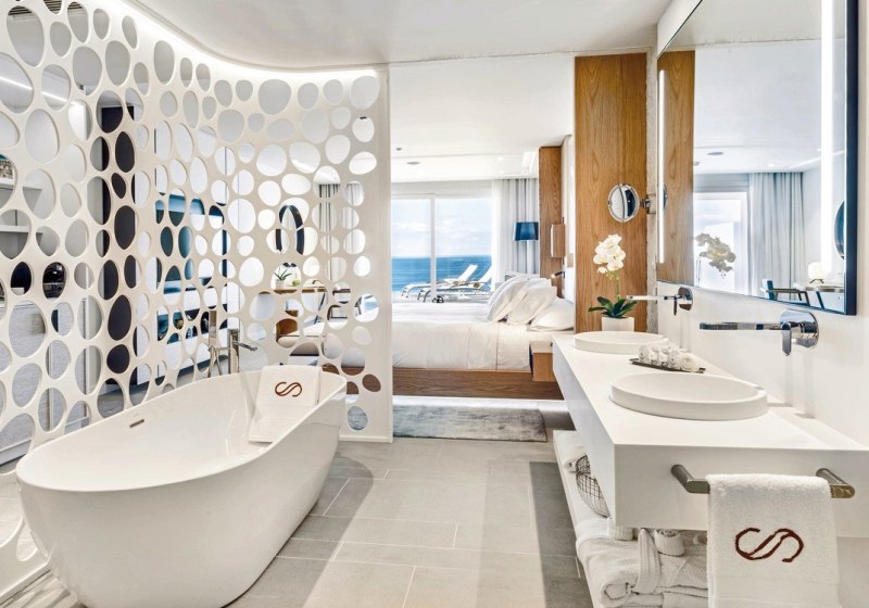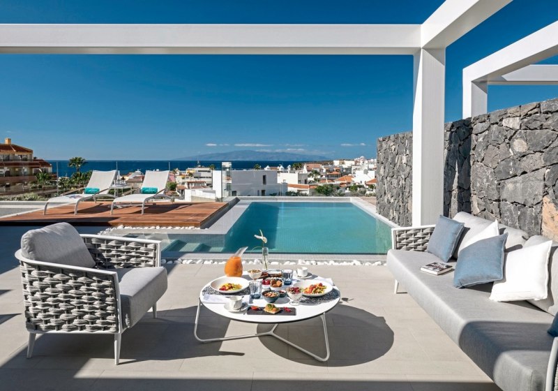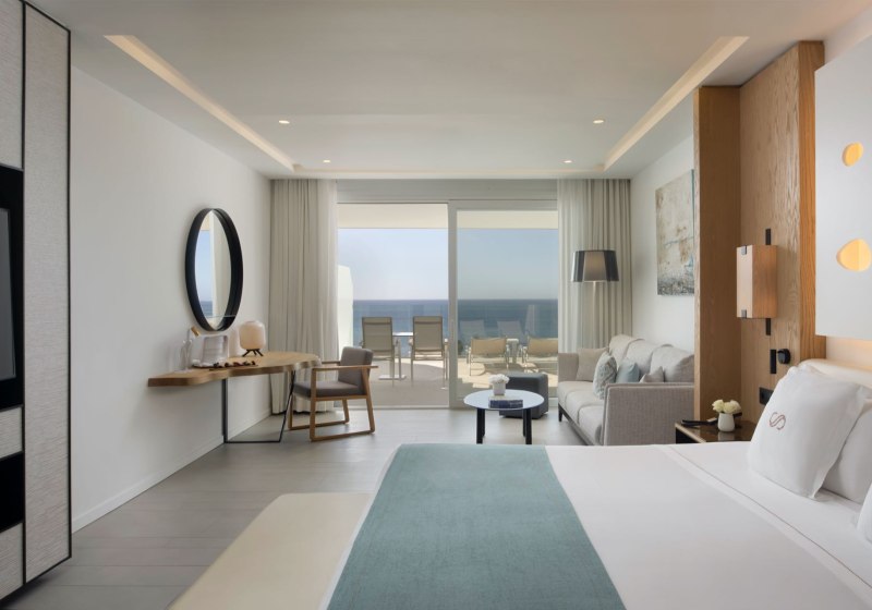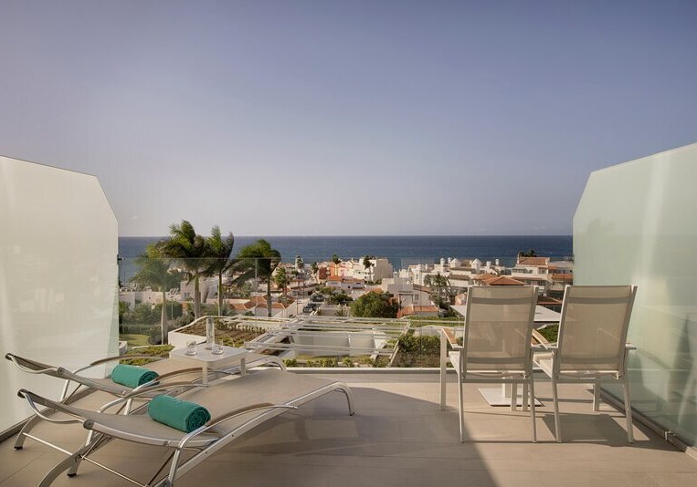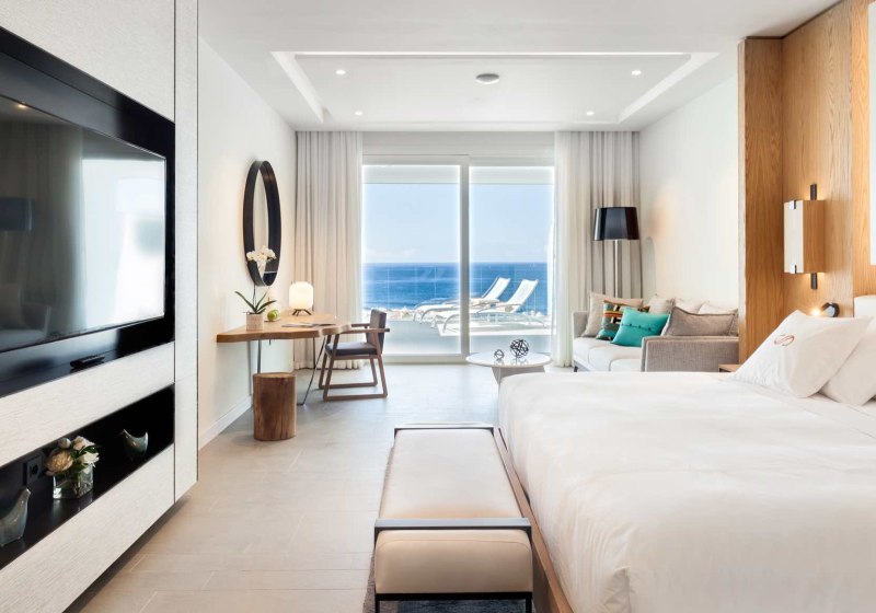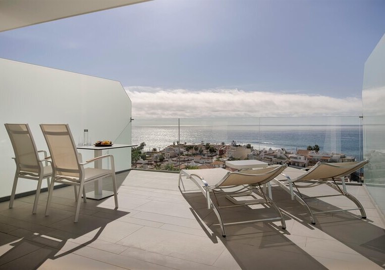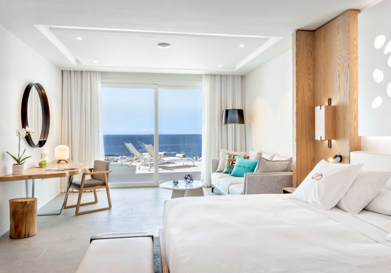 Ein starkes Merkmal ist die große, möblierte Terrasse. Einige Juniorsuiten bieten dort sogar einen Whirlpool, Panorama-Meerblick ist erhältlich. Das Design bleibt klar und zweckmäßig, mit viel Raum für Rückzug – ideal für Paare, die Privatsphäre schätzen und den Blick auf den Atlantik in Ruhe auskosten möchten.