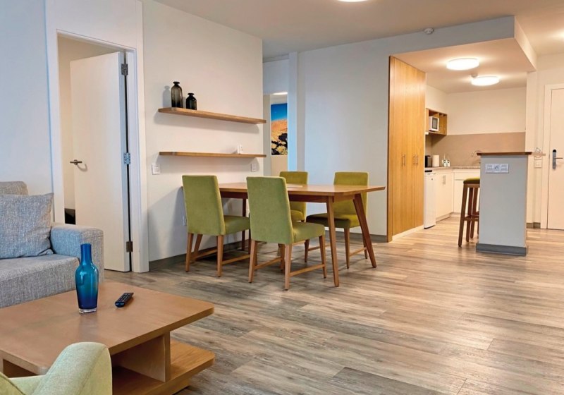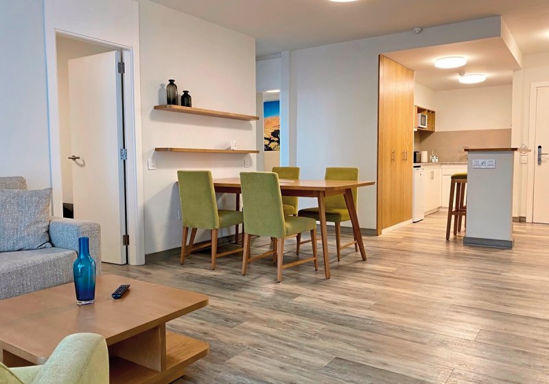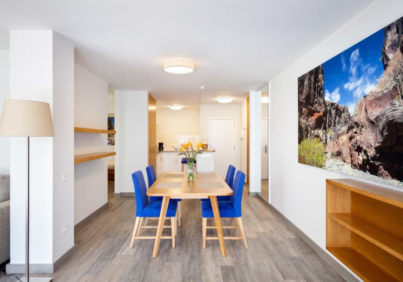 Die 29 renovierten Appartements messen circa 60 bis 80 Quadratmeter und sind für strukturierte, längere Aufenthalte ausgelegt. Ihr wohnt in einem separaten Schlafzimmer und einem Wohnraum mit Essbereich; die Kitchenette ermöglicht flexible Tagespläne zwischen Selbstversorgung und Restaurantbesuch. Jede Einheit verfügt über eine möblierte Terrasse, um die milden Stunden draußen zu verlängern.