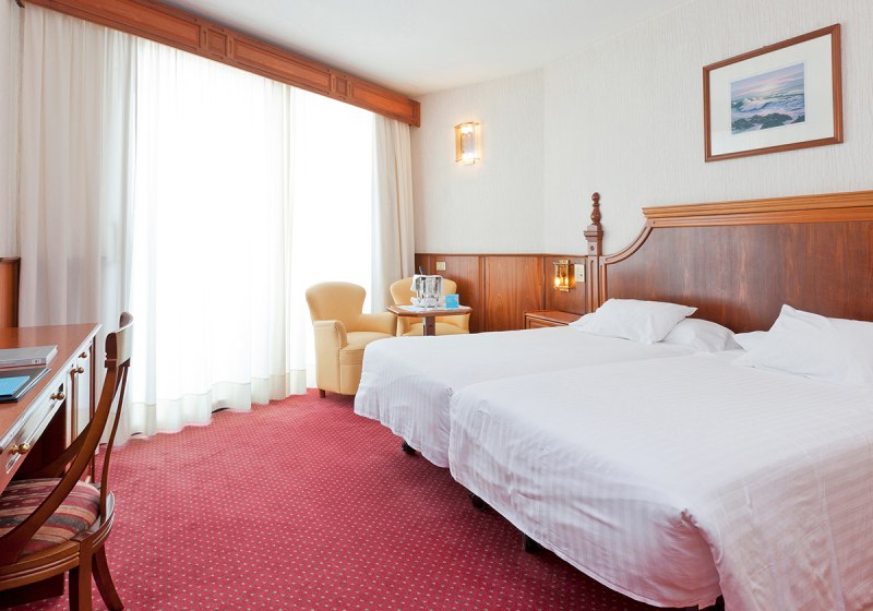 Die Zimmer setzen auf Ruhe und klare Funktionalität: schalldämmende Fenster, Parkettboden, Klimaanlage und kostenloses WLAN. Sat-TV, Safe und Minibar runden den Komfort ab. Das Bad ist mit Badewanne ausgestattet; in den Deluxe-Zimmern ergänzt eine Regendusche das Setup, in Superior-Zimmern eine Hydromassage-Badewanne.
